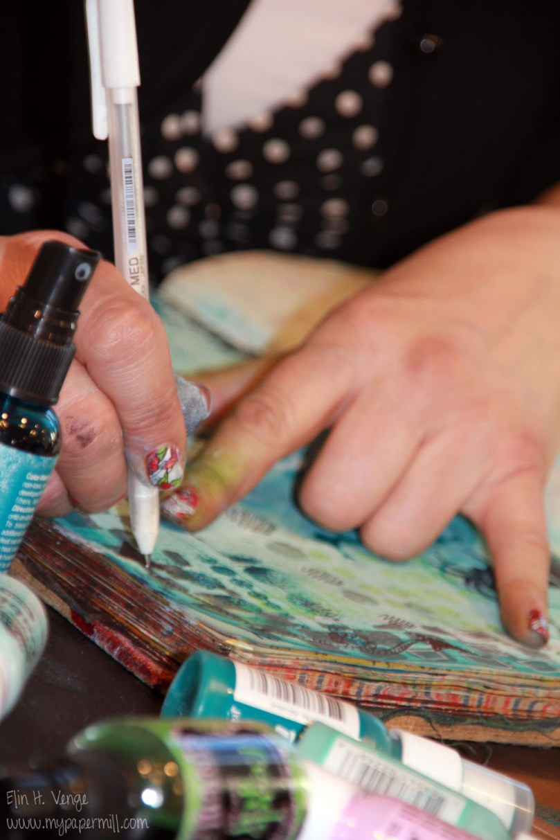 Litt doodling hører med, så var faktisk tagen ferdig. Her brukte hun en hvit Glaze-penn. Jeg har selv et par Glaze-penner (jeg er en pennefrik), de er gode å skrive med og etterlater en herlig skinnende overflate (det siste høres ut som en reklame for et skuremiddel på kjøkkenet eller badet)!