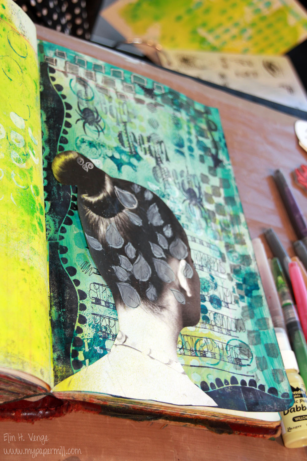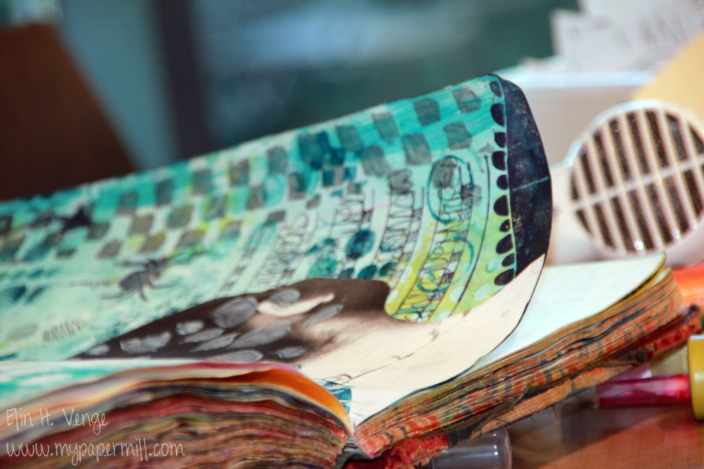 Tenk at det er mulig å gå fra en helt hvit side uten noenting til dette; fiks ferdig AJ-side på 32 minutter! Her har hun fått med seg bakgrunn med våtservietter, med fingrene og med dabber, hun har mistet, hun har brukt gesso, hun har stemplet, hun har doodlet, hun har limt og hun har skrevet tekst, ikke så mye riktignok, men den er nå der. Noe a la: ”I made this in Norway. The lady didn’t glue the top.” Alt på 32 minutter. Jeg må innrømme at jeg har litt lyst til å prøve meg jeg også. Hadde jeg bare ikke blitt så grisete på fingrene…