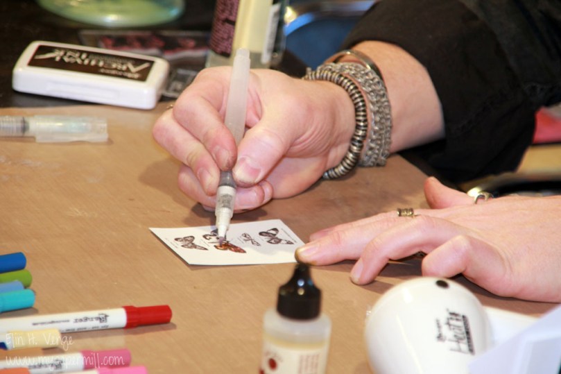 Han begynte med et sommerfuglstempel fra platen ”Attic Treasures” som han stemplet på Specialty Stamping Paper, før han begynte å fargelegge med distressmarkers.