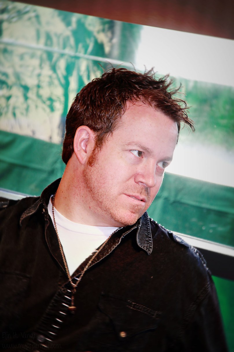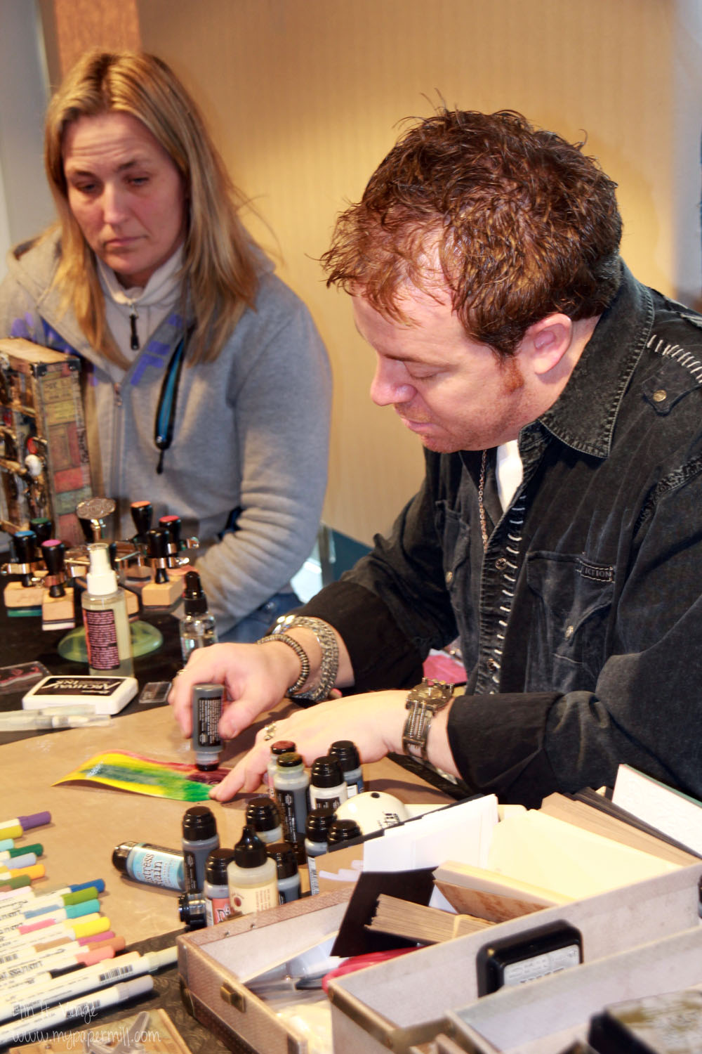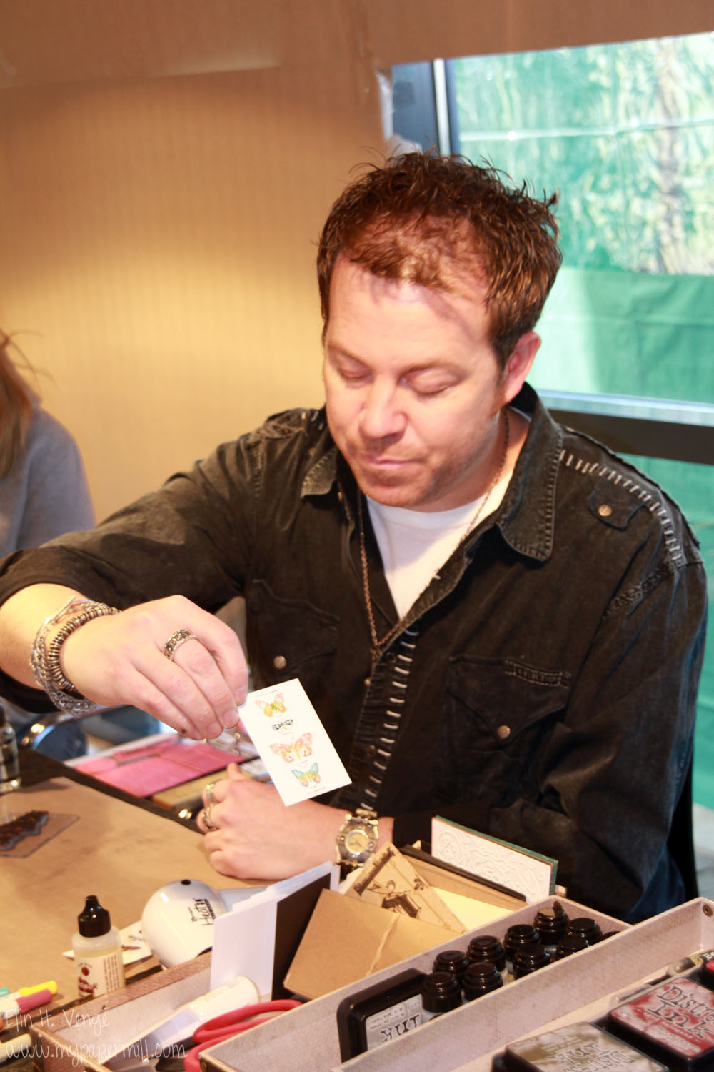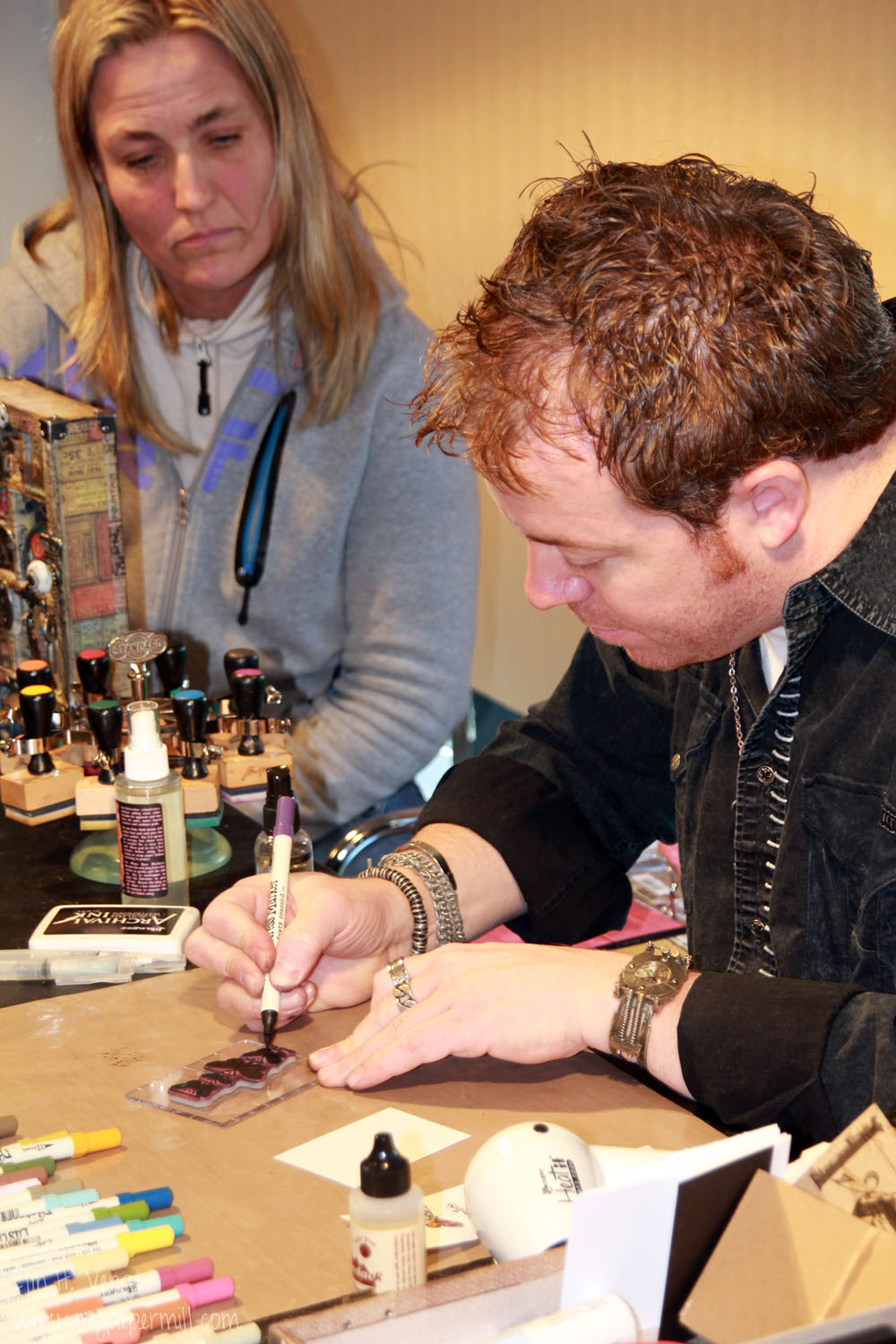 Over til denne herremannen! Han trenger vel egentlig ingen introduksjon: Tim Holtz, scrappeverdenens ubestridte konge, med stor K og stor ONGE! På dette bildet ser blikket kanskje litt ondskapsfullt ut, men han snakket bare kort med Alain (igjen, Ranger-sjef) før demoen skulle begynne, det var nok bare blinkskuddet mitt som ble litt ekstremt! Det var ikke like lett å ta bilder av demoen til Tim, hovedsaklig fordi lyset på demoen til Dyan var SÅ mye bedre!! Lyset hos Tim var mye gulere. Egentlig merkelig, med tanke på at det er snakk om det samme lokalet, Dyans bord var tross alt bare noen meter til høyre for Tim sitt.