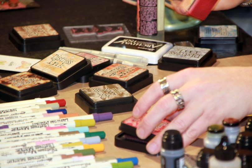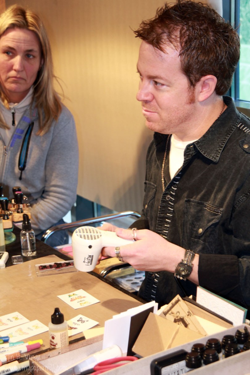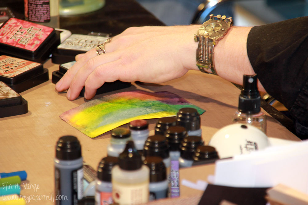 Helt fra første sekund var det tydelig at dette kom til å bli en helt annen demo enn Dyans, Tim var mye roligere, snakket mye saktere, hadde et veldig mye ryddigere bord med karusellen sin med sine ink blending tools i forskjellige fargekategorier og en cargo case med distress inks, stains og andre nødvendigheter, i tillegg til noen småprosjekter og alle distresstusjene foran seg. Den hvite filla var trygt og godt plassert i fanget hans. Hvis du har sett noen TH-videoer skjønner du hva jeg mener når jeg snakker om den hvite filla. Han er egentlig en veldig ryddig person ser det ut som, mens Dyan hadde mistet ting og dabbere og sprayflasker lå uten korker og i et herlig kaos når hun var ferdig (det er godt å vite at jeg ikke er den eneste som holder på sånn).