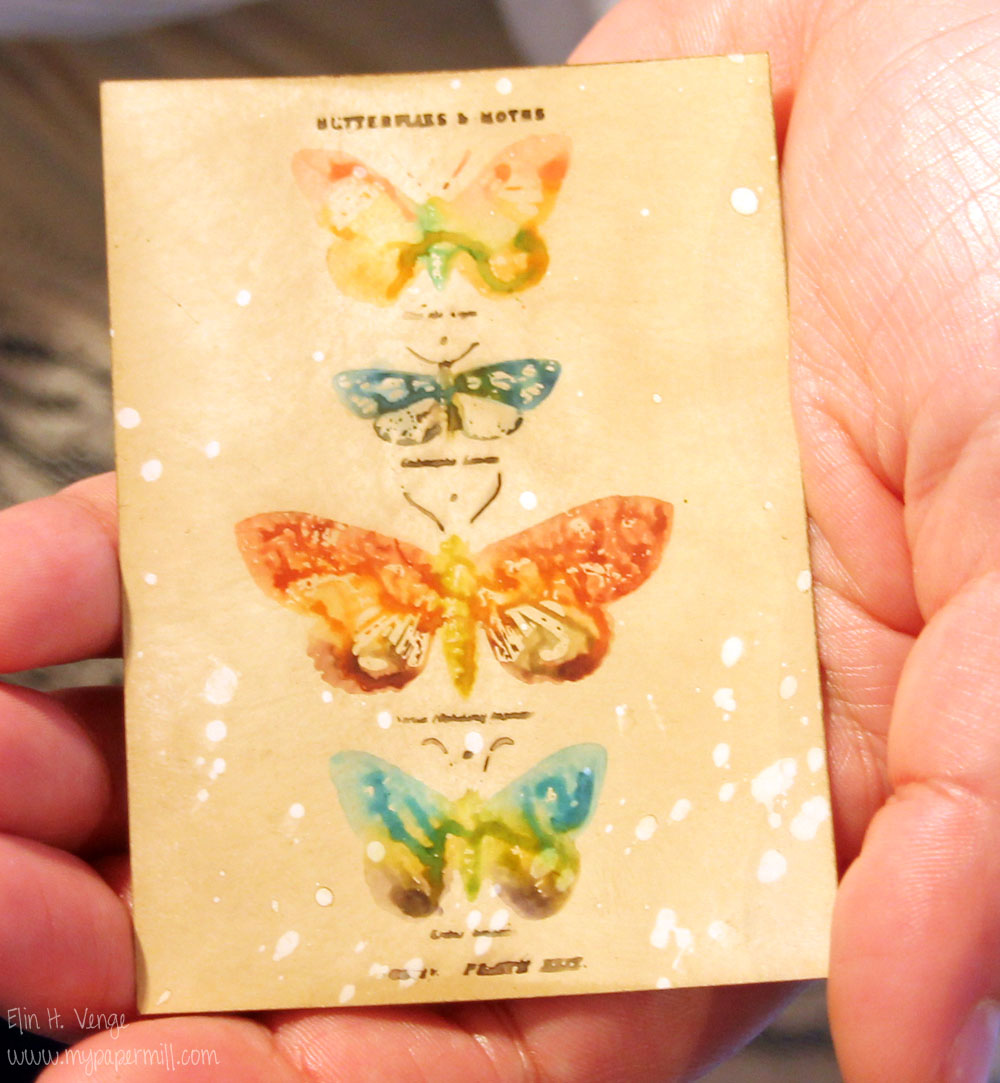 Til slutt gikk han over hele arket med ink blending tool med brushed corduroy, så slang han på noen dråper med vann som han trykket bort med den berømte filla. Fargene er like rene og fine, selv etter at hele arket har fått samme fargen over hele seg holder sommerfuglene seg vibrante i fargene!!