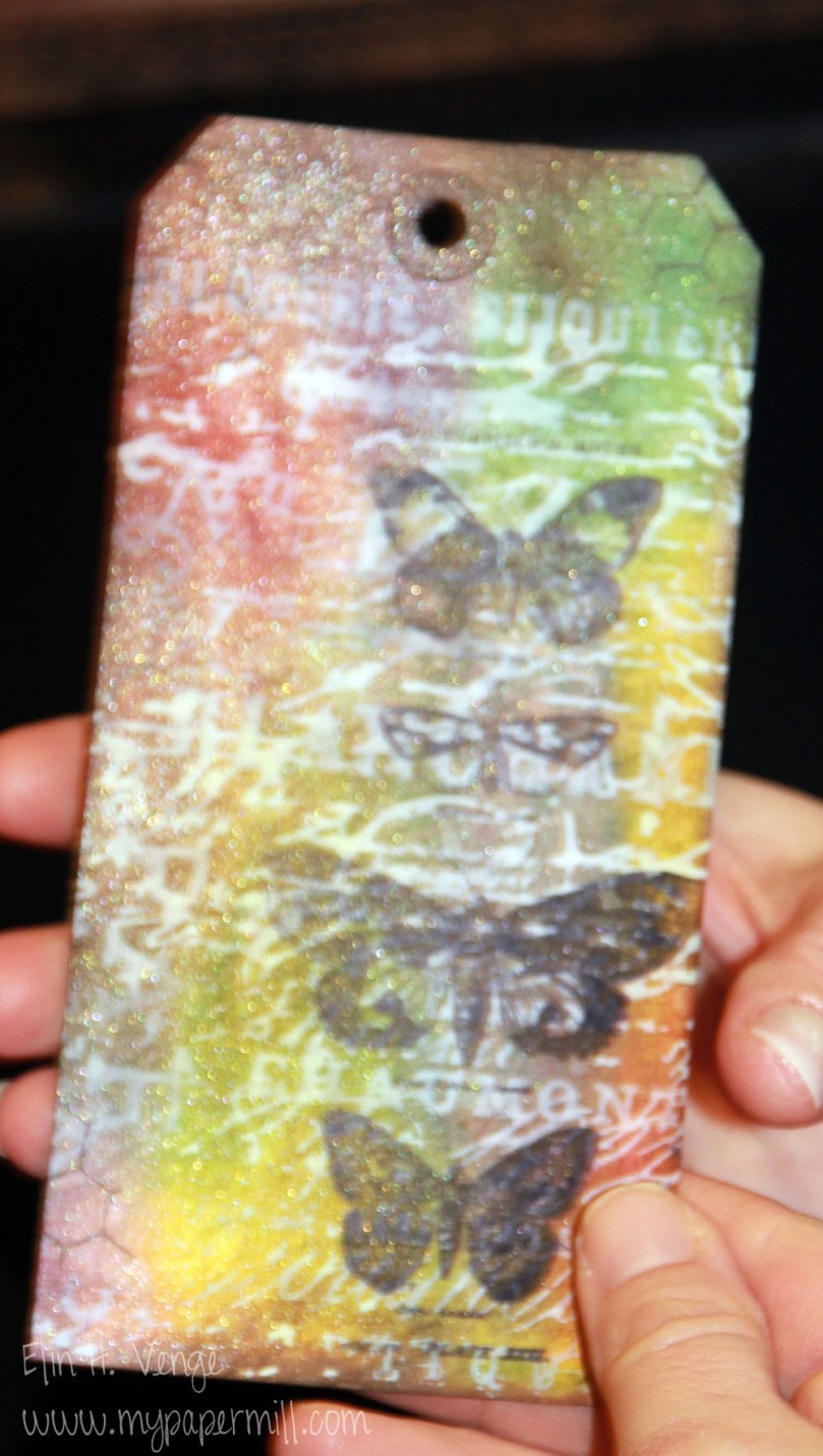 Sommerfuglstempelet ble stemplet på høyresiden av tagen med svart, permanent blekk (Archival), og så tok han hønsenettingstempelet fra Mixed Media-platen løst i hånden og stemplet det her og der på tagen. Siste finishen er et par sprut av Perfect Pearls Mist i Heirloom Gold, og da var tagen ferdig!