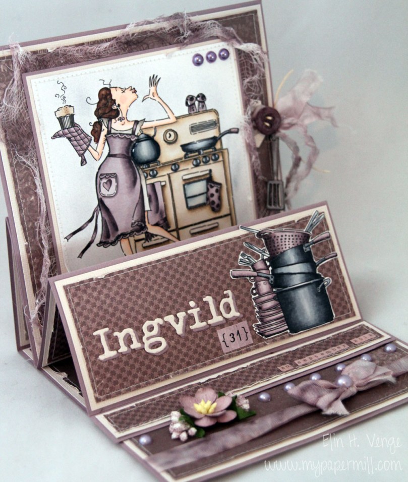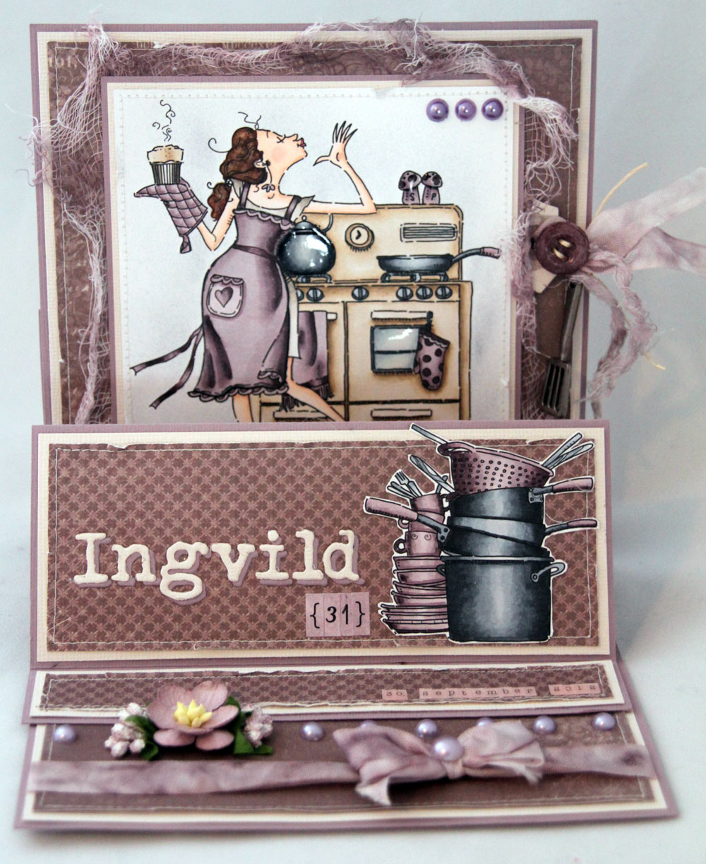 Arkene som er brukt er fra Pion Designs “Minnenas Ateljé”-kolleksjon, mens motivene er fra Mo Manning, som alltid fargelagt med mine helt fantastiske Copics, jeg digger de tusjene (som om ikke det var klart fra før). {31} er laget med hvite klistremerker fra MM farget med Copic, hvit seam binding er også farget med Copic, det samme gjelder blomsten fra WOC og pyntebærene fra Kort og Godt. Ostekluten er farget med Copic og kakespaden er farget med Copic for at den skal bli mer lilla enn grå. Nevnte jeg at jeg liker disse tusjene???