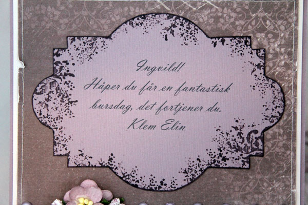 Skrivefeltet på “innsiden” av kortet. Her har jeg stemplet med et Stempelgledestempel rundt kanten med V99. Ja, du kan bruke Copic-tusjene til å stemple med, du må bare være rask. Har jeg fortalt at jeg liker disse tusjene?? Selve teksten er laget i Photoshop til å matche V90-serien, man kan laste ned swatch-filer til bruk i photoshop fra copicmarker.com for å matche en spesifikk farge helt perfekt. For en perfeksjonist som meg er det helt ypperlig!!