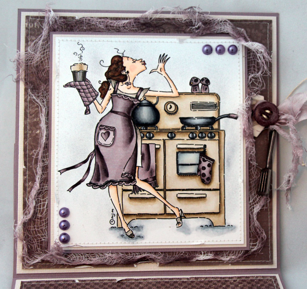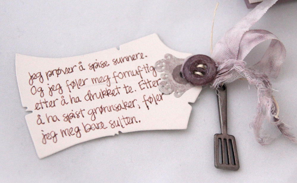 Bak motivet skjuler det seg en tag med en herlig kakespade og en hvit knapp jeg bare MÅTTE farge lilla (selvfølgelig med Copic-tusj). Har brukt rester av osteklut og seam binding, også farget med Copic, til å ha noe å dra ut tagen med, i tillegg til scrapper’s floss. Selve teksten er skrevet med en brun Copic Drawing-penn.