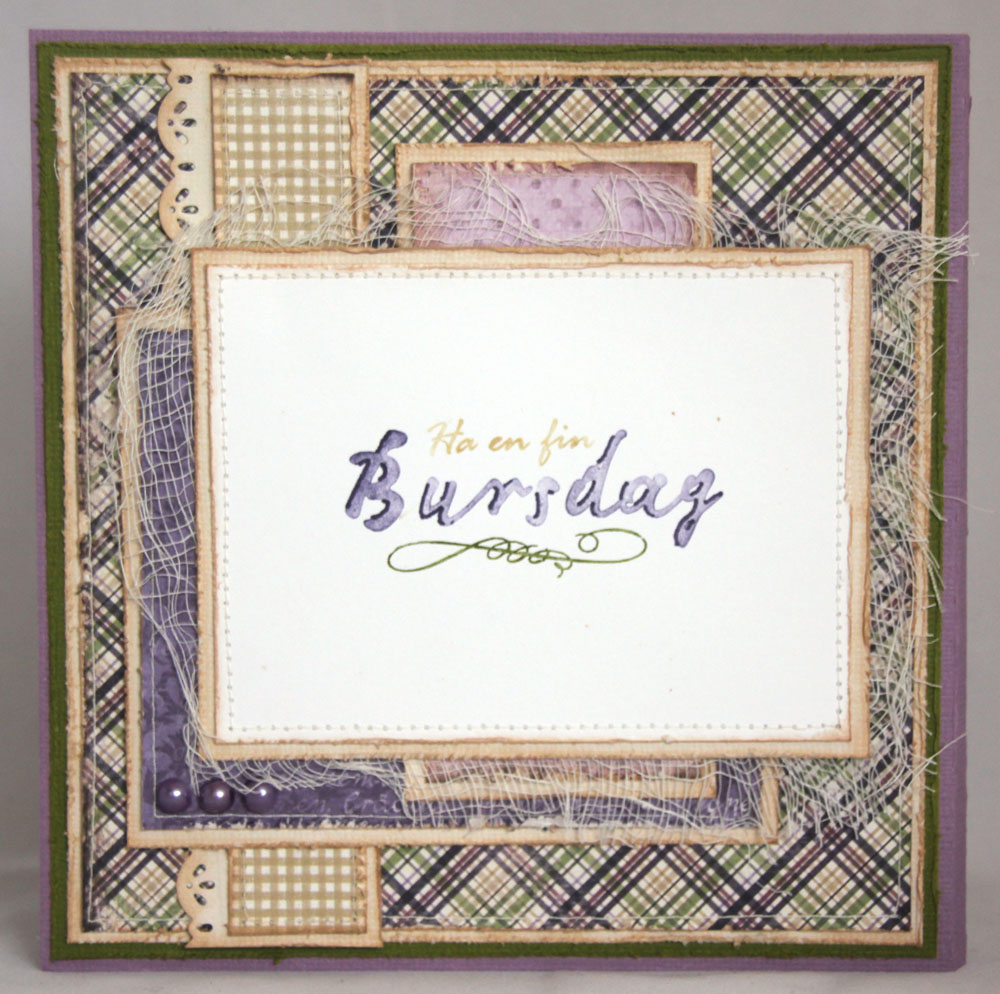 Jeg hadde egentlig tatt frem et annet motiv og andre ark til dette kortet, men da jeg fikk somlet meg til å kjøpe gave matchet ikke gavepapiret med papirene jeg hadde valgt meg ut (Maja Designs Lantliv-kolleksjon), og da byttet jeg ut både papirene og motivet. Papirene jeg endte opp med er derfor fra Ska vi ta en Fika?-kolleksjonen, jeg har brukt arkene “Mandelkaka m plommon”, “Våffla m björnbärssylt”, “Björnbärsrutor”, “Två fröknar” og “Sockerkaka”. Noen av de hadde jeg bare rester av, men det er greit å få brukt opp det også!! Kartongen er i fargene Hillary, Vanilla og en lillafarge jeg dessverre ikke vet navnet på. Som vanlig med mine kort er det mange lag, totalt med kartong, mønsterark og motiv/tekstpaneler er det 44 lag i tillegg til basen på kortet, hvis du ser bort fra osteklut og tagen. Alle paneler er rufset, mange av den svertet, og en del av dem også sydd.