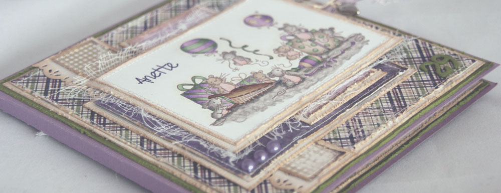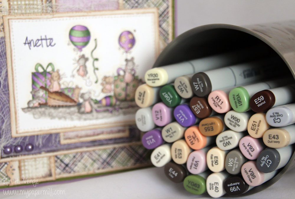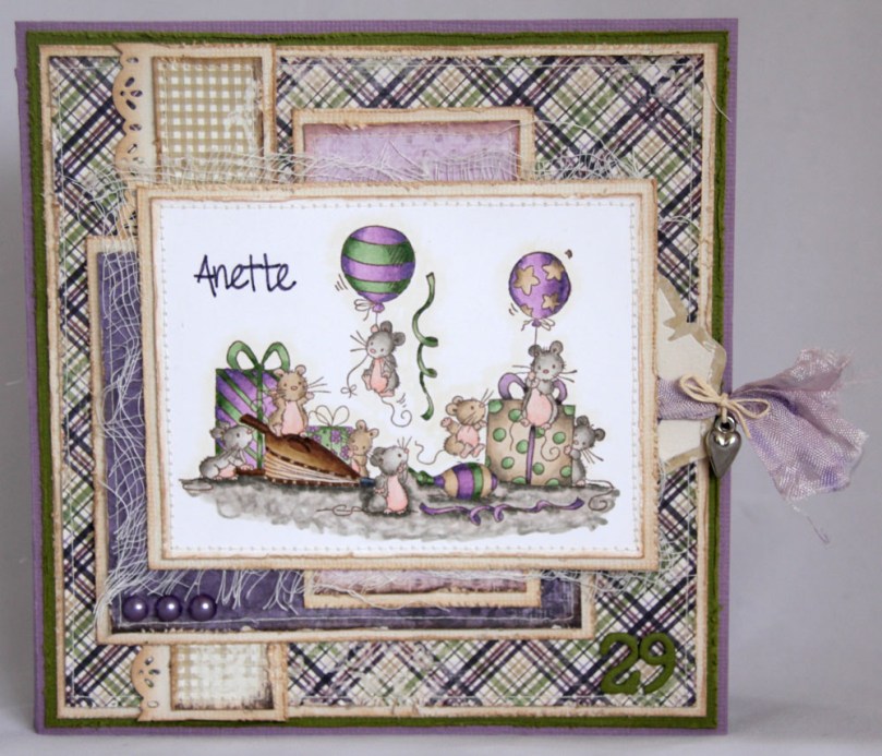 Motivet er fra Lili of the Valley og heter “Birthday Balloons”, som vanlig fargelagt med Copics. Når jeg først så dette motivet i nettbutikken til LOTV måtte jeg bare ha det, ikke nødvendigvis fordi musene var så søte, men pga peisblåseren (heter det det?) som de søte små musene bruker til å blåse opp ballongene med!! Egentlig passer dette musemotivet perfekt til min søster, hun hadde nemlig kallenavnet “Musa” når hun var yngre fordi hun var så liten. Vår kusine, som er ca et halvt år yngre enn Anette, var en god del større og ble kalt “Rotta”…