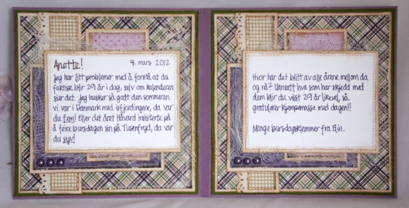 Som vanlig med mine kort har jeg det samme oppsettet på innsiden som ellers på kortet. “Anette!” er skrevet med Distress Markers i både Antique Linen og Dusty Concord, mens resten av teksten er skrevet med Dusty Concord. Perlene er fra Kort og Godt, forøvrig det samme som på fronten og bak på kortet.
