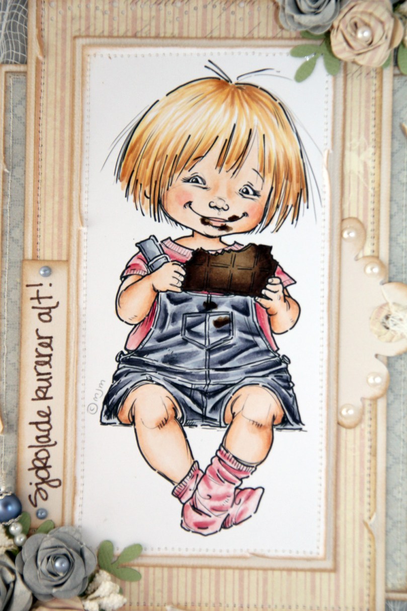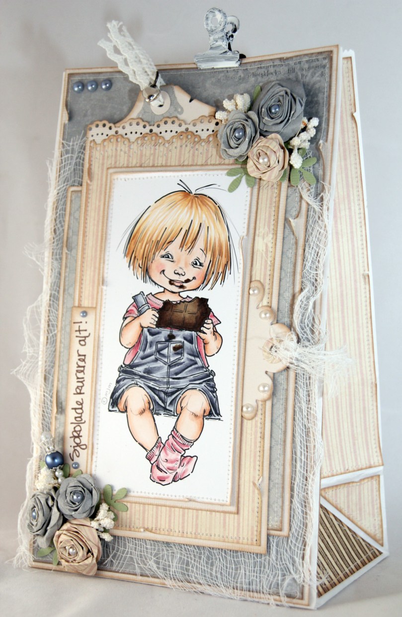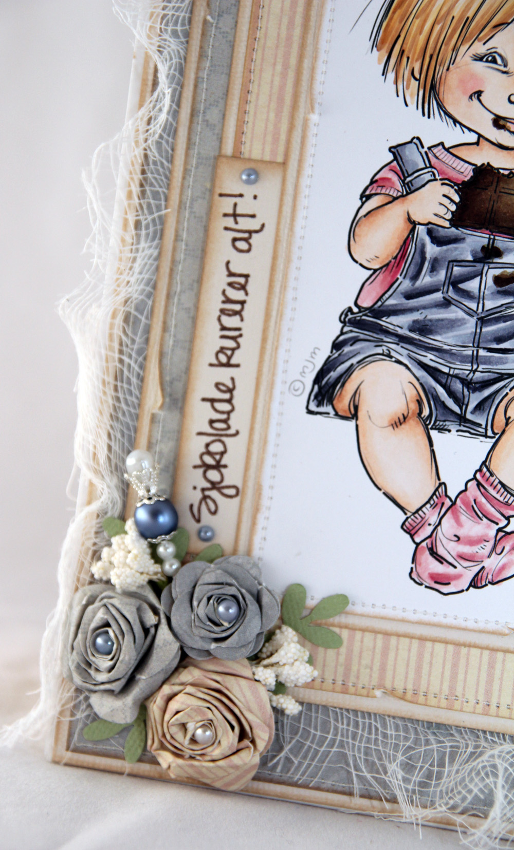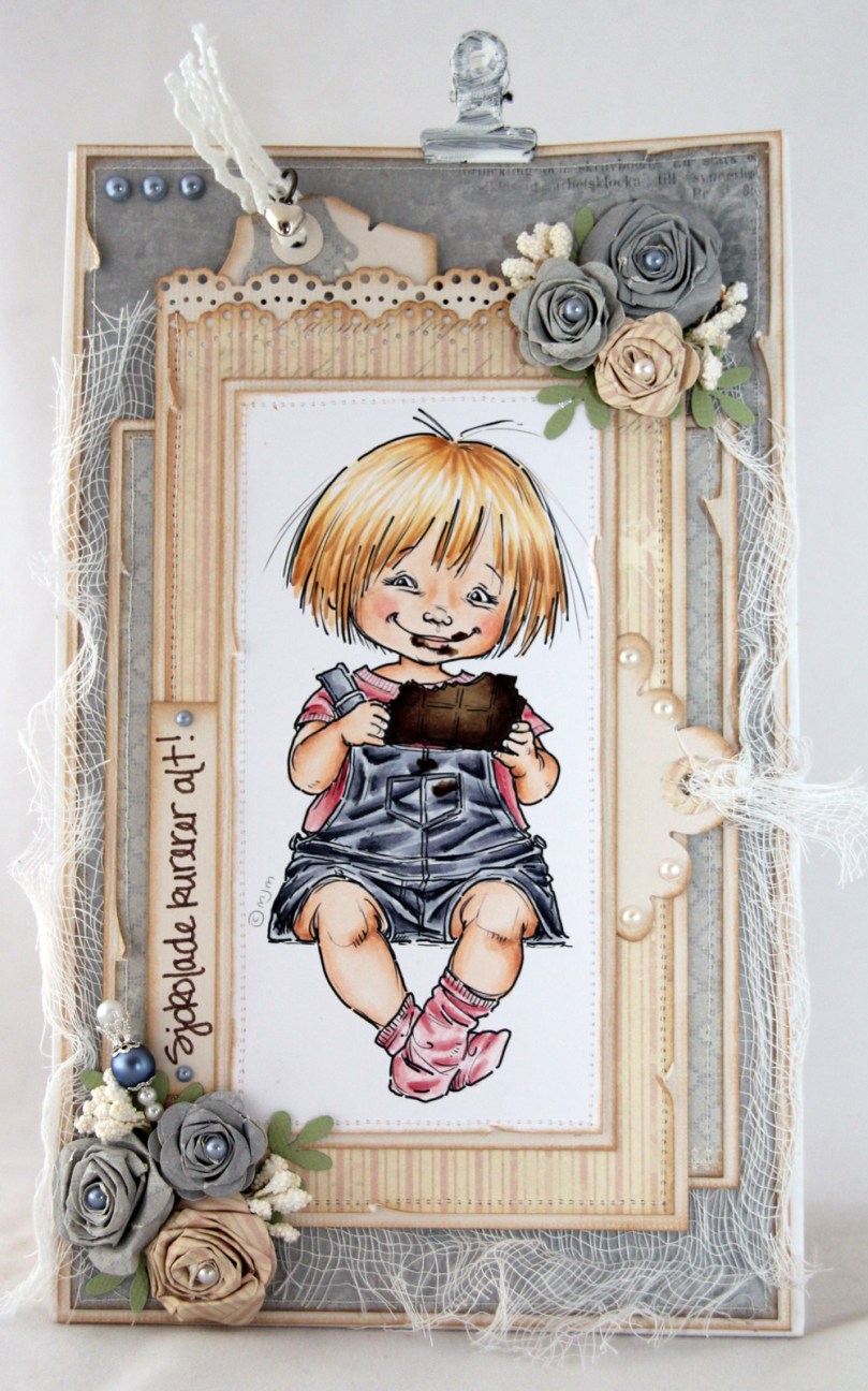 I made the card for Anette_S when I colored a bunch of different images for her. All the patterned papers and the cute little dragon are from Magnolia, and as usual with my cards I’ve sewed, inked and distressed the edges. On this card I’ve even added a layer of stickles on top of it all to make it even more girly. The flower arrangement is pretty much a carbon copy from the birthday card Henrikke sent me, she truly is a master at arranging flowers on cards!!