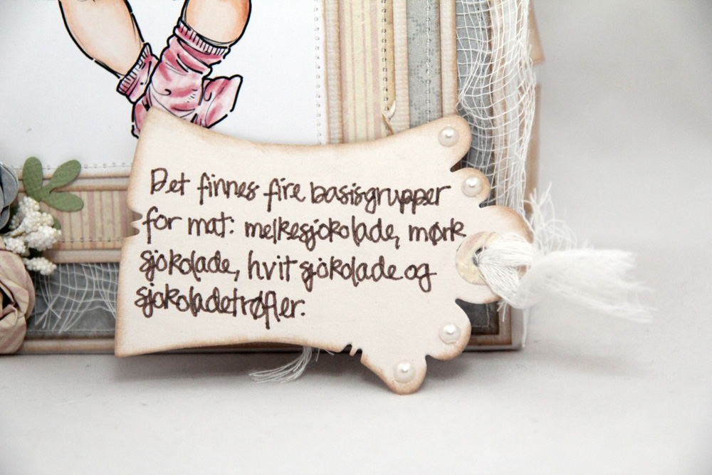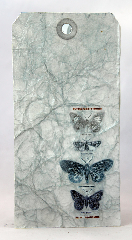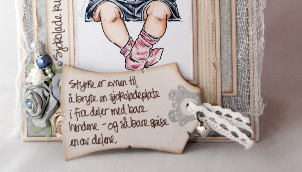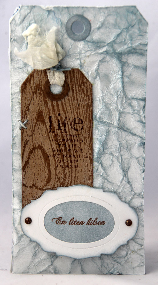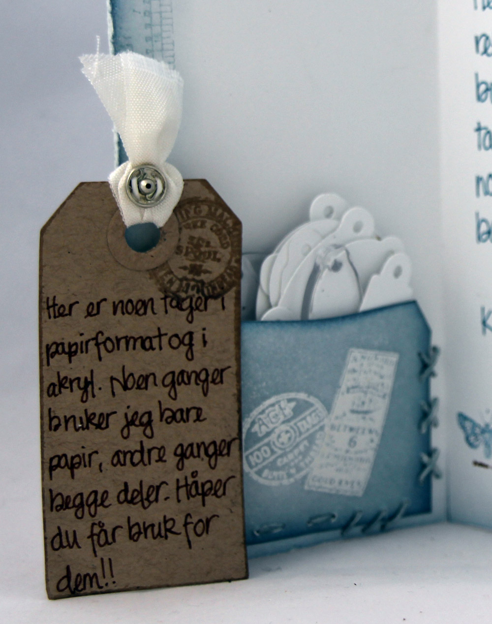 Tagen er stanset ut med en Magnoliadie. Ikke noe uvanlig syn på mine kort akkurat, jeg syns disse tagdiesene til Magnolia er kjempefine og bruker mine MYE. Stempelet er fra Stempelglede og er stemplet med Distress Markers i fargene Tumbled Glass, Broken China, Old Paper, Bundled Sage og Vintage Photo, genialt at man kan få flere farger på et og samme stempeltrykk på denne måten. Seam binding fargelagt med Copics og knyttet fast med floss med en sommerfuglcharm, som står i stil til Magnoliaarket med sommerfugler, som syns hvis du ser etter det!!