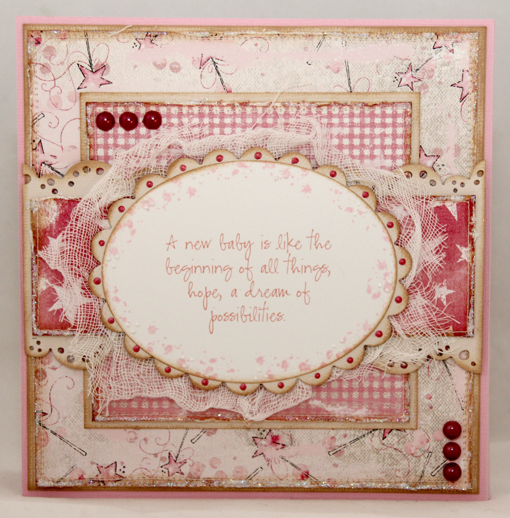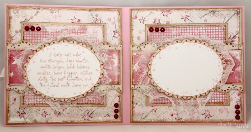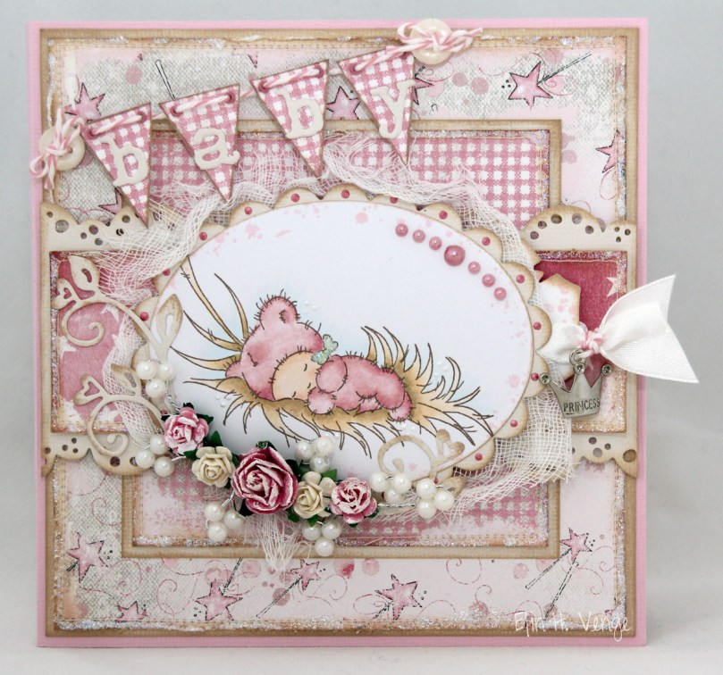 Kortet ble veldig råååååsa, med mønsterark fra Magnolia. Følgende ark er brukt: Vintage Magic Wand fra “Princes & Princesses”-kolleksjonen, Pink Starlit fra “Once upon a time”-kolleksjonen og Strawberry Plaid fra “Sweet Rainbow”-kolleksjonen. Alle paneler er sydd, svertet, rufset og fått solide doser med Stickles Star Dust.