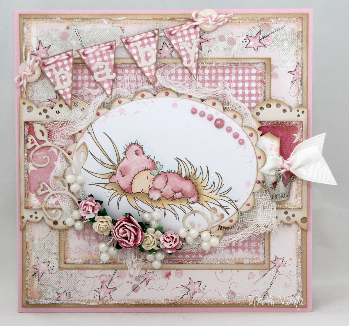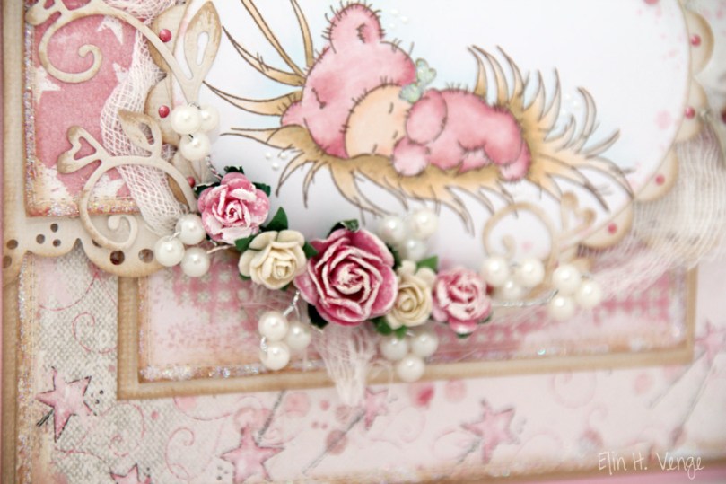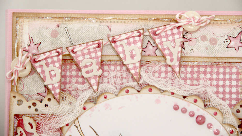 Bak motivet har jeg skjult en tag, stanset ut med en Magnolia-die. Denne har også blitt svertet i kantene med Creamy Brown og stemplet med Splash-stempelet til Inkido. Jeg har skrevet ut en søt liten tekst om babyer og satt på silkebånd med twine og en prinsessekronecharm, det må jo være passe til en liten jentebaby!!