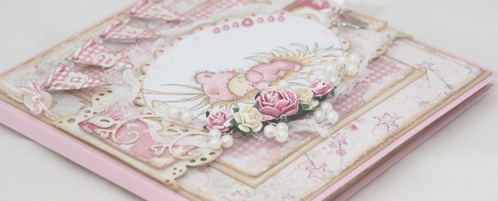The card is very piiiiiink, with patterned papers by Magnolia. I’ve used the following: Vintage Magic Wand from the “Princes & Princesses” collection, Pink Starlit from the “Once upon a time” collection, and Strawberry Plaid from the “Sweet Rainbow” collection. All the panels have been sewn, inked, distressed and they’ve also received copious amounts of Stickles Star Dust.