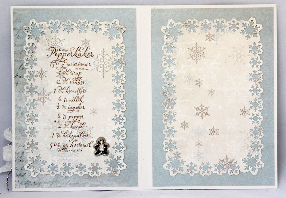 Innsidene har de samme arkene som fronten, og det samme oppsettet. Høyresiden har plass til personlig hilsen, mens venstresiden er prydet med et pepperkakeoppskriftstempel fra Ladybug & Friends, samt en liten pepperkakemann nede i det høyre hjørnet.