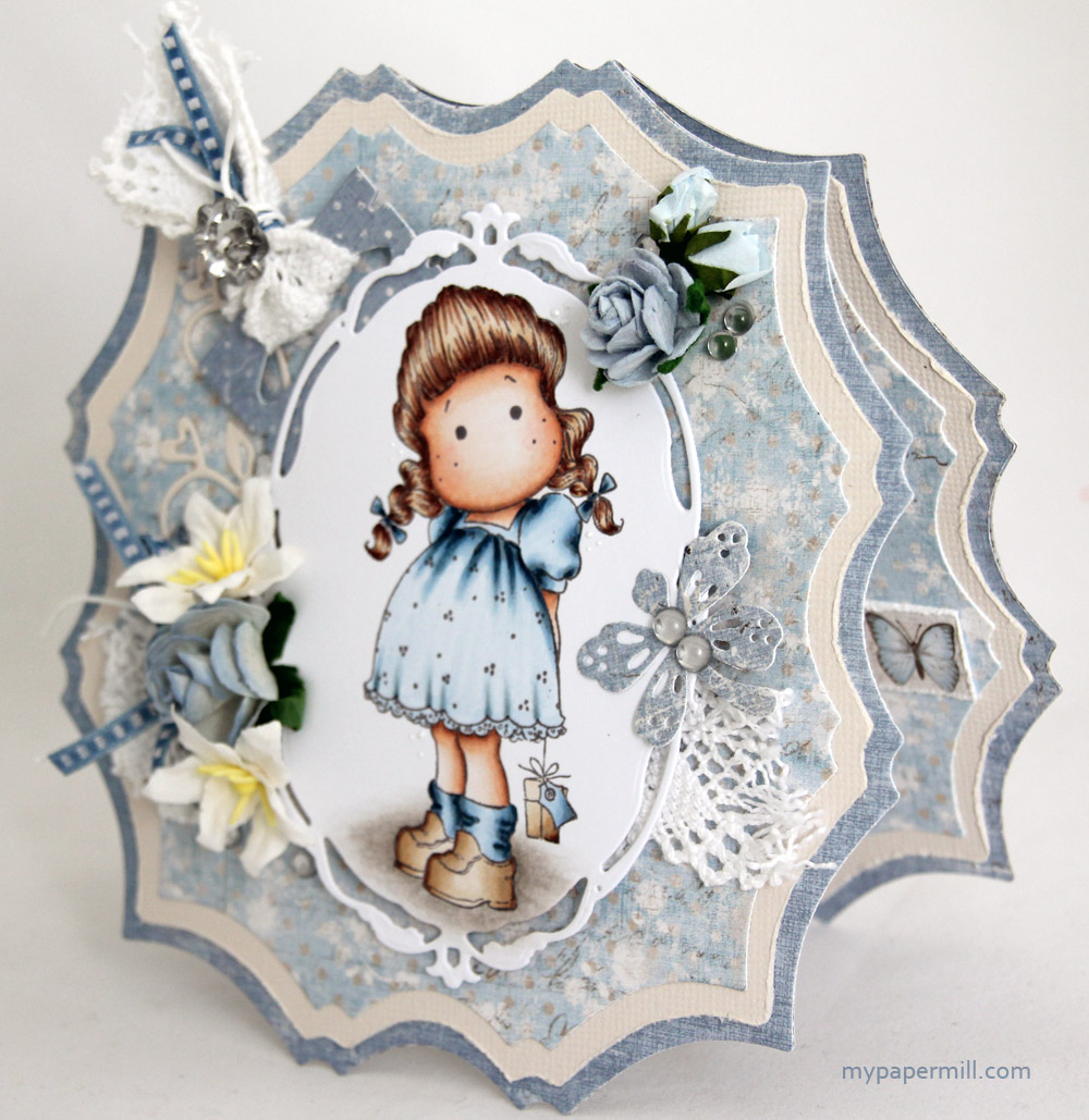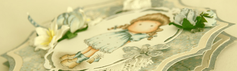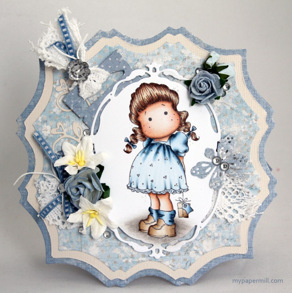 I made the card with Maja Design papers (7th of March, 6th of April and 7th of April, all from the “Vintage Spring Basics” collection) and a set of GoKreate dies (Large Frilly Frame #6) for the base. I love these dies by GoKreate – as if by magic, cards made with these frame sets automatically appear more interesting than just plain old regular 6×6″ ones. Tilda with Small Gift is diecut with a Spellbinders die (from the set “Opulent Ovals”) and mounted on dimensional tape. I’ve had the lace in my stash for ages, the same goes for the blue ribbon, bought at Scrap & Sånn, which was a scrapbooking store in Trondheim. Sadly, it closed a few years ago, they had the best selection of ribbon I’ve ever seen. The flowers I’ve used are a mix from Wild Orchid Crafts, Kort & Godt and possibly even Papirloftet and Magnolia. The little dragonfly is most definitely diecut with a Magnolia die, the same goes for the heart swirl I”ve added. The little dew drops I’ve added on the dragonfly and also in a few other spots are by Staz.