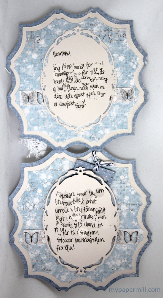 The insides are made very simply, I’ve added more Opulent Ovals diecuts with a handwritten, personal greeting, unreadable after playing with the image in Photoshop. The butterfly borders from the back of one of the design papers replace the lace on the front, while I’ve added another tag with a tiny little bit of text behind one of the panels.