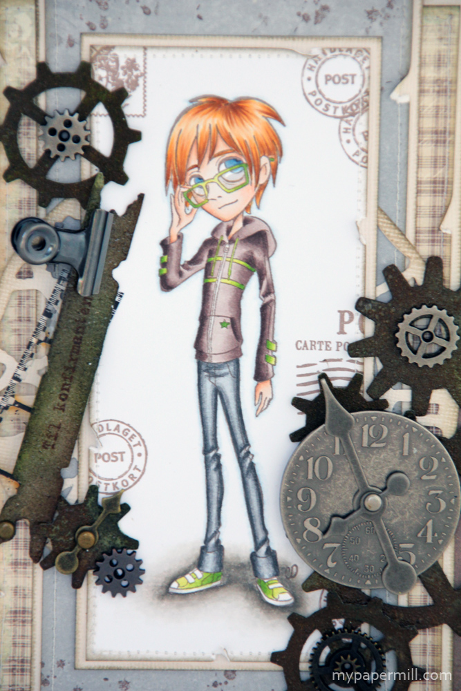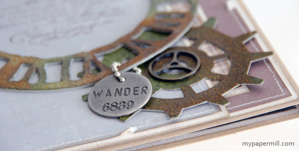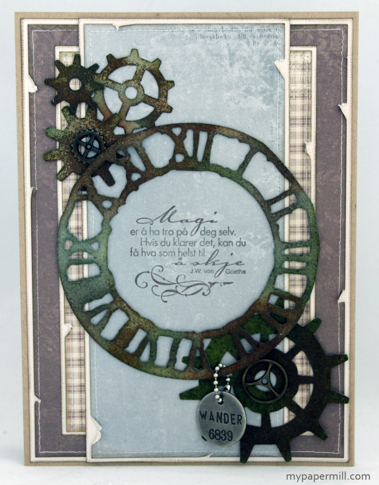 På baksiden av kortet har jeg brukt de samme tannhjul-diesene som på fronten av kortet. De er stanset ut i grungepaper og behandlet likt som de andre jeg har brukt. Har også stanset ut en klokke i grungeboard med Weathered Clock-die’en til godeste Tim, og den har også fått samme behandling som resten av grunge’n!!