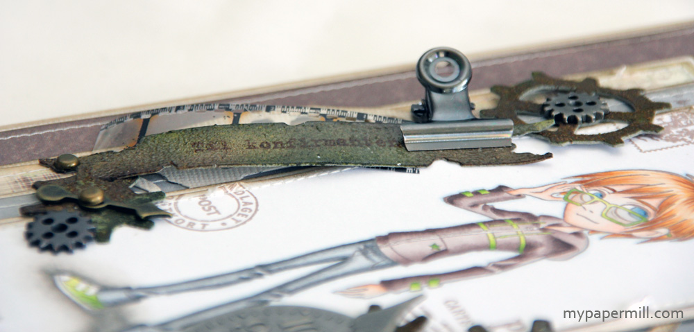 Jeg har stemplet et konfirmantstempel fra Kort & Godt med Archival Ink (Coffee) på grungepaper som er stanset ut med en Sizzlitz-die fra Tim Holtz (Tattered Banners), og så svertet banneret med distress ink (peeled paint, vintage photo og weathered wood), før det til slutt er embosset med klart embossingpulver fra Ranger. Til slutt er det festet til motivet med en klype, det samme er en liten filmstripe, også den er fra Tim Holtz. Den mannen gjør det mulig å lage guttekort!!