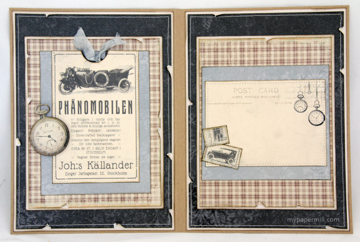 Som alltid har mine kort også pyntede innsider. Her har jeg gjort om et av bildene fra klipparket til en lomme til en tag. På høyresiden er det plass til personlig hilsen. Jeg har også klippet ut en klokke av et av arkene som jeg satt på 3D-puter på venstresiden, og jeg har satt på et par frimerker på høyresiden. Det ene frimerket tar igjen bilmotivet fra “reklamen” på venstresiden, mens klokken jeg har satt på venstresiden tar igjen klokkene øverst på postkortet på høyresiden. På den måten hører sidene sammen, selv om de ikke er like!