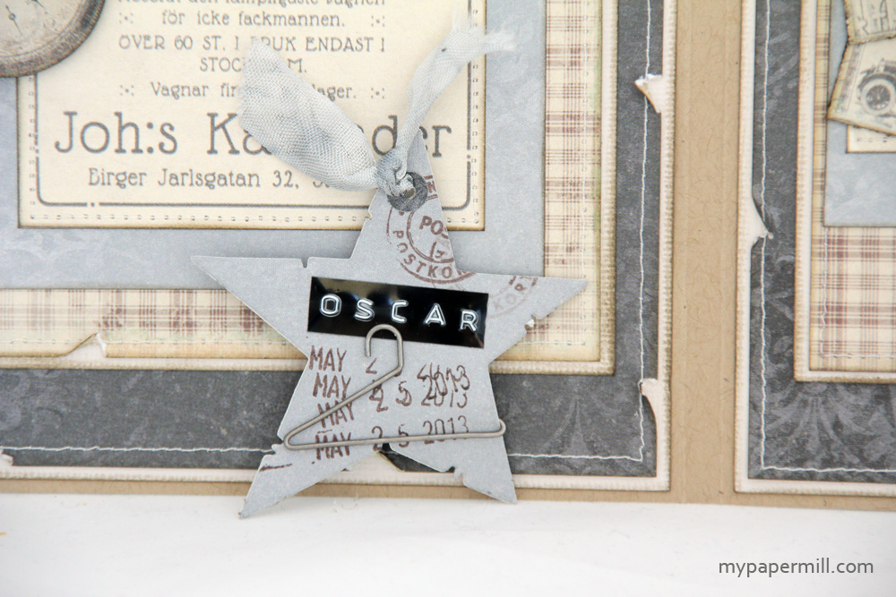Guttekort (og også herrekort) er ikke spesielt enkle kort å lage, men med mønsterark fra Till Far-kolleksjonen fra Pion Design (Klippark, Kostym, Fickur og Herrar) er ingenting umulig, det umulige tar bare litt lengre tid!! Jeg har faktisk også brukt et ark fra Till Mor-kolleksjonen (det lyse gråblå), men det er det ingen som klarer å se! Kortet er, ikke uvant fra meg, i kjent lag-på-lag-stil, med bazzill kraft og Vanilla som base. Alle mønsterarkene har tatt turen innom symaskinen, og enkelte steder er papiret revet litt. Alle paneler er også svertet med distress ink walnut stain, og Klänningar-arket fra Till Mor-kolleksjonen er stemplet med Inkidos Splash-stempel for å få litt mer liv i kortet.