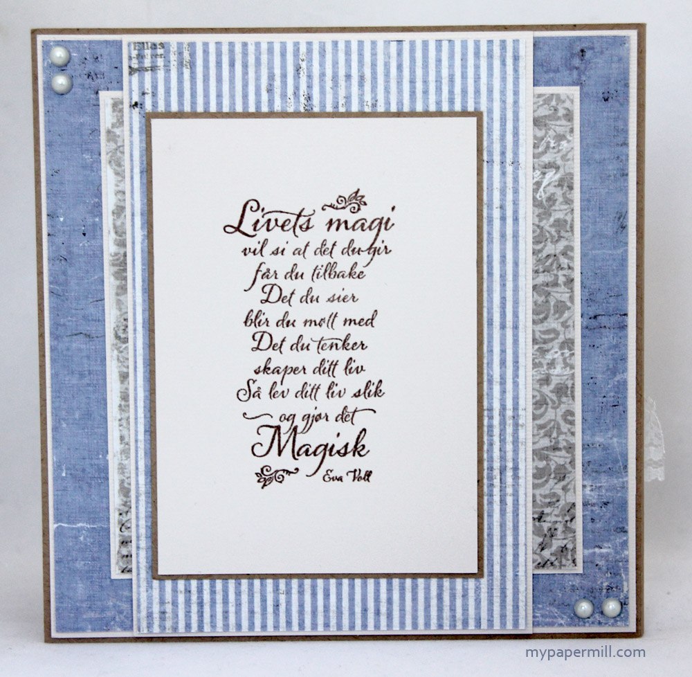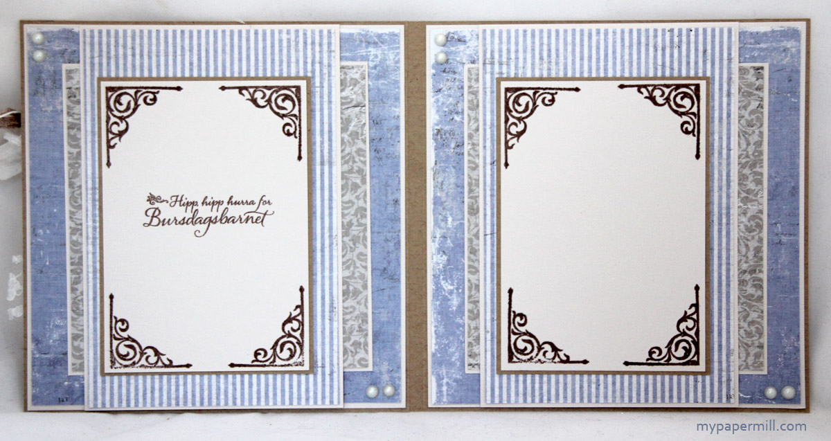 Mary 80 innsiderI made the insides fairly flat, knowing the card would be sent in the mail. Just a few pearls have been added. I stamped the Lili of the Valley corner stamps in Memento Rich Cocoa, and did the same with the Kort & Godt sentiment on the left. The right has plenty of room for a personal greeting.