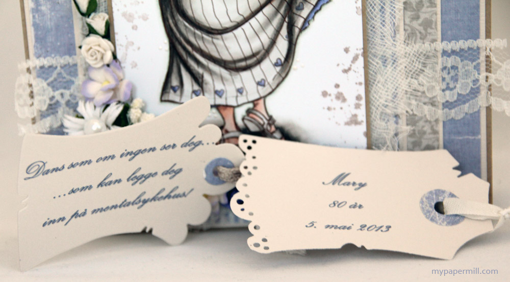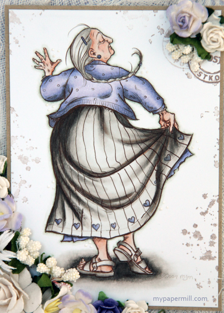 Mary 80 tager uteTwo tags made with Magnolia dies are hidden behind the image. The one on the left reads: “Dance like no one’s watching… who can have you committed to a mental hospital!” The other tag just has a name, age and date written on it, all in the lovely Copic color V25.