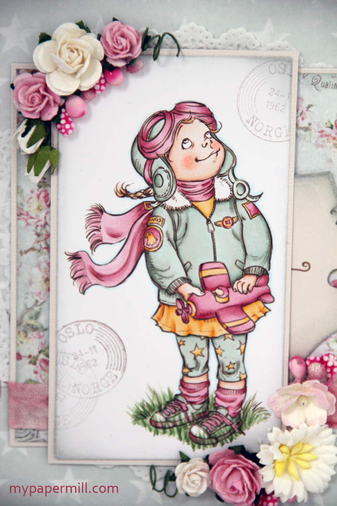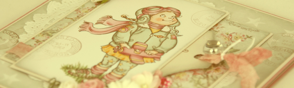 Motivet er Mo Mannings Dream G., printet ut i brunt (!) på X-Press It blending card og fargelagt med Copics, som vanlig. Blomstene jeg har brukt er en blanding fra Wild Orchid Crafts og Kort & Godt, i tillegg til at jeg har sneket inn noen rosa pyntebær fra Magnolia.