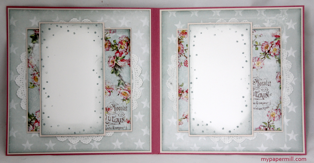 Innsidene har jeg gjort meget enkle. Har stemplet et stempel fra Kort & Godt i kantene på tekstpanelene med distress ink Iced Spruce og svertet med samme farge.