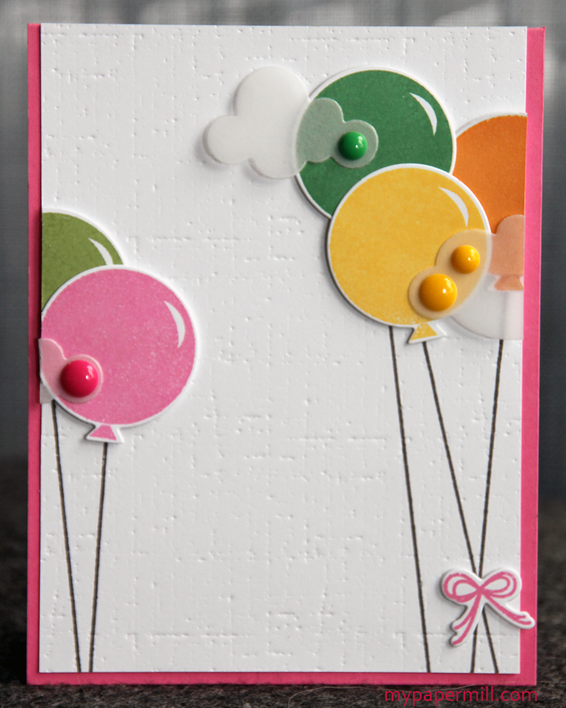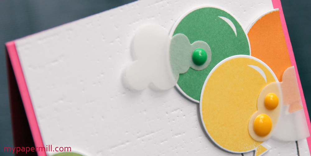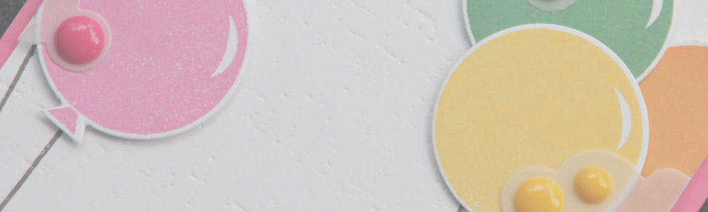 Alle ballongene ble satt på bittesmå 3-D-puter før jeg limte på vellumskyer med mini gluedots. Til slutt stemplet jeg en sløyfeknute i rosa på en diecut som jeg også limte på med 3-D-puter.
