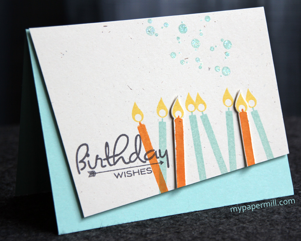 Basen på kortet er laget av et halvt lettersize-ark fra Papertrey Ink i fargen Aqua Mist, brettet i midten på tvers, så kortet måler 5 1/2 x 4 1/4″. Jeg stemplet noen lys fra Birthday Style-stempelsettet, også i fargen Aqua Mist, på Rustic Cream kartong, også den er fra PTI. Jeg har ingen oransje stempelputer, så de oransje lysene er faktisk stemplet med Distress Paint i fargen Spiced Marmalade. Det går veldig fint å stemple med Distress Paint, bare sørg for å rense stempelet ordentlig før malingen får en mulighet til å tørke. Flammene er stemplet med Memento Dandelion, og tekststempelet er i fargen Espresso Truffle, også den fra Memento. To av de oransje lysene er stanset ut med die som koordinerer med stempelsettet, og diecutene er satt på bittesmå 3-D-puter for litt dimensjon. Til slutt la jeg på litt Stickles Star Dust på “konfettien” jeg stemplet øverst på kortet.