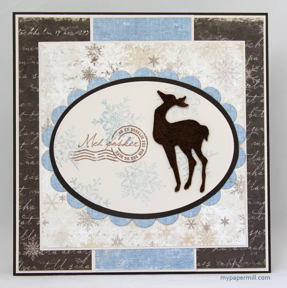 Baksiden er også rimelig enkel. De samme snøfnuggene fra Tim Holtz har blitt stemplet også her, og reinsdryret er stanset ut av grungeboard med en Movers & Shapers-die fra Tim Holtz (Reindeer & 25 Set). Reinsdyret er svertet med distress ink (vintage photo), før det er embosset med distresspulver (vintage photo). Teksten ved siden av er fra Kort & Godt, stemplet med Memento Rich Cocoa.