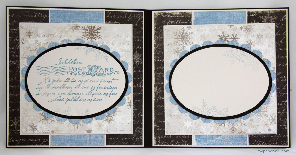 Enkle innsider med samme oppsett som på forsiden. Her er det en juletekst fra Kort & Godt som får spille hovedrollen, sammen med noen snøfnuggstempler fra Tim Holtz (Grunge Flakes), som alle er annengangsstemplet for å få et svakere trykk. God plass på høyresiden til personlig hilsen.