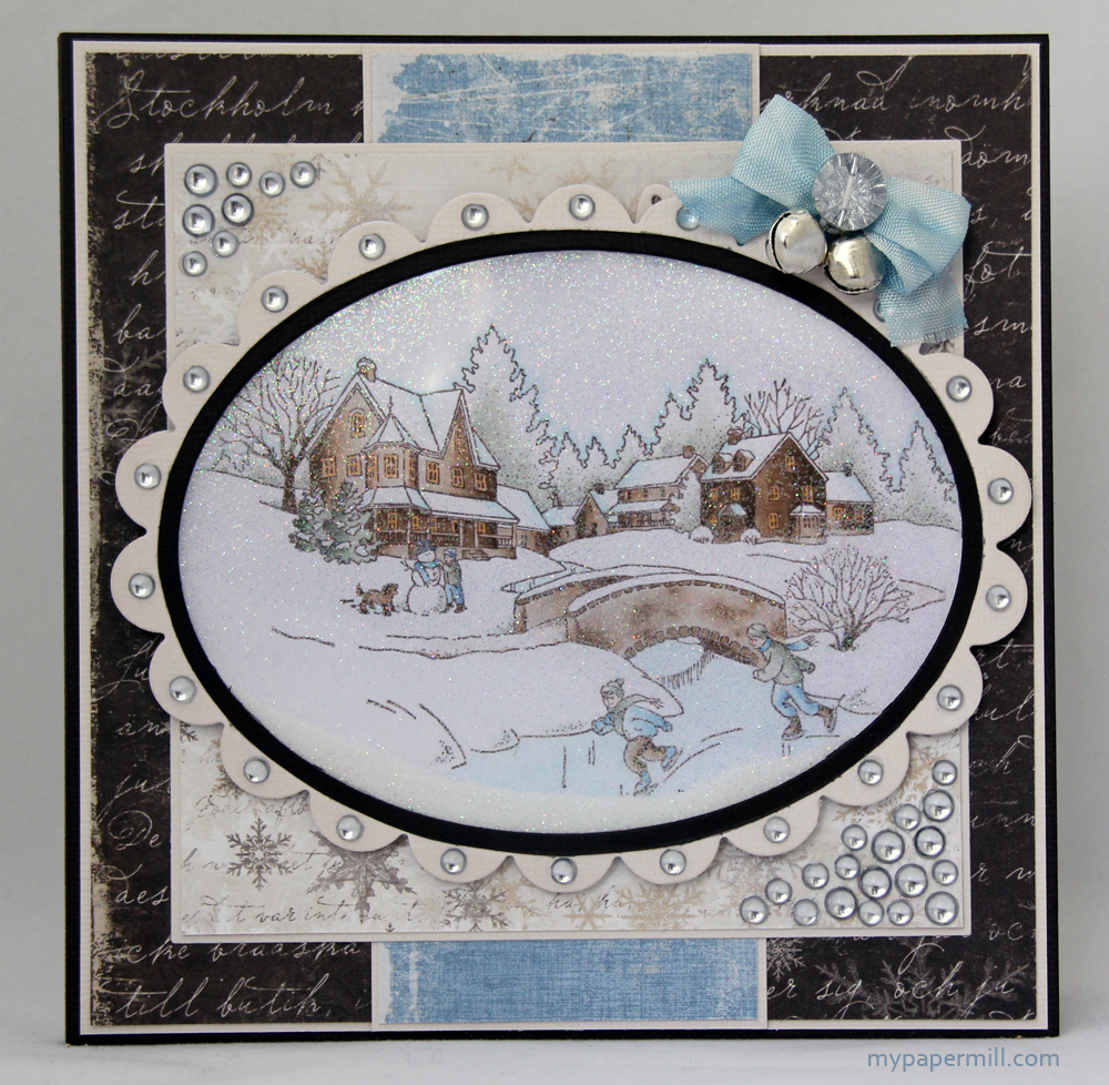 Motivet er Snowy Winter Scene fra Inkadinkado, farget med Copics som vanlig. Har brukt Bazzill Java og Vanilla, i tillegg til tre mønsterark fra Maja Design – “Snöflingor” og “Tankar om julen” fra Julen är här-kolleksjonen og “6th of April” fra Vintage Spring Basics-serien. Hovedpanelet har jeg laget som et shaker-panel, med masse glitter fra doodlebug inni, og duggdråper fra Staz på scallopkanten rundt, i tillegg til i clusters i et par hjørner.
