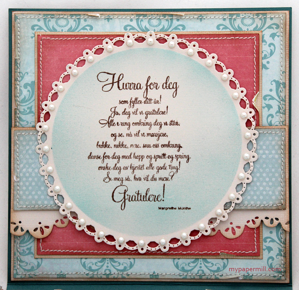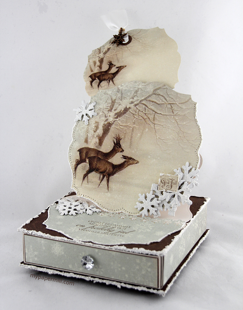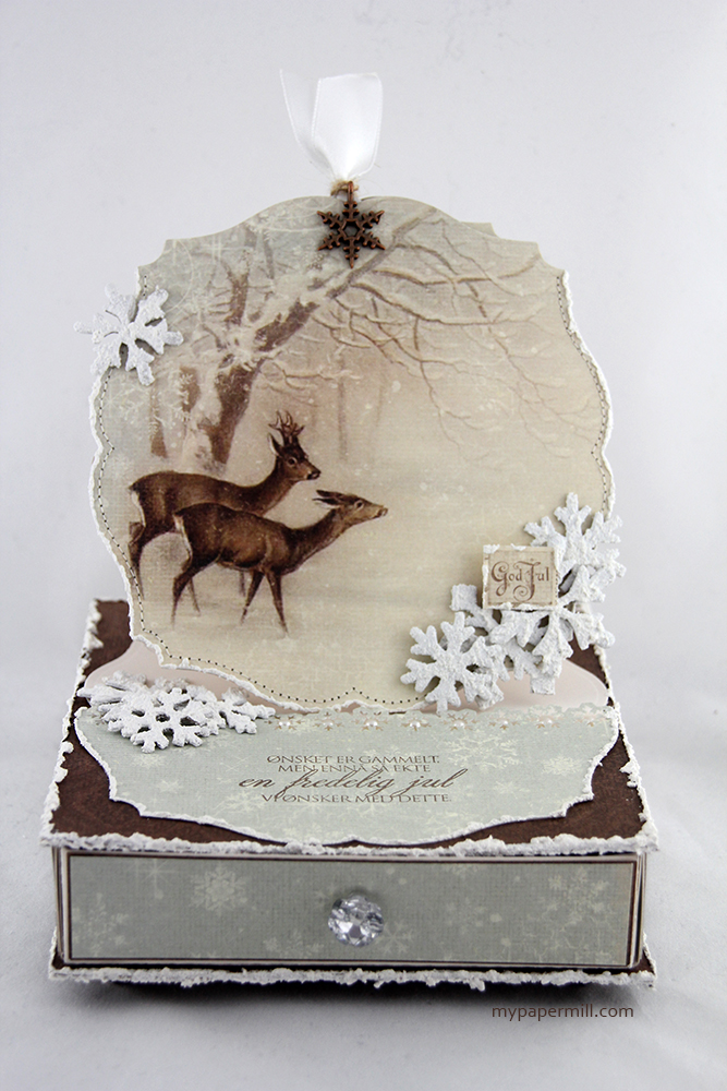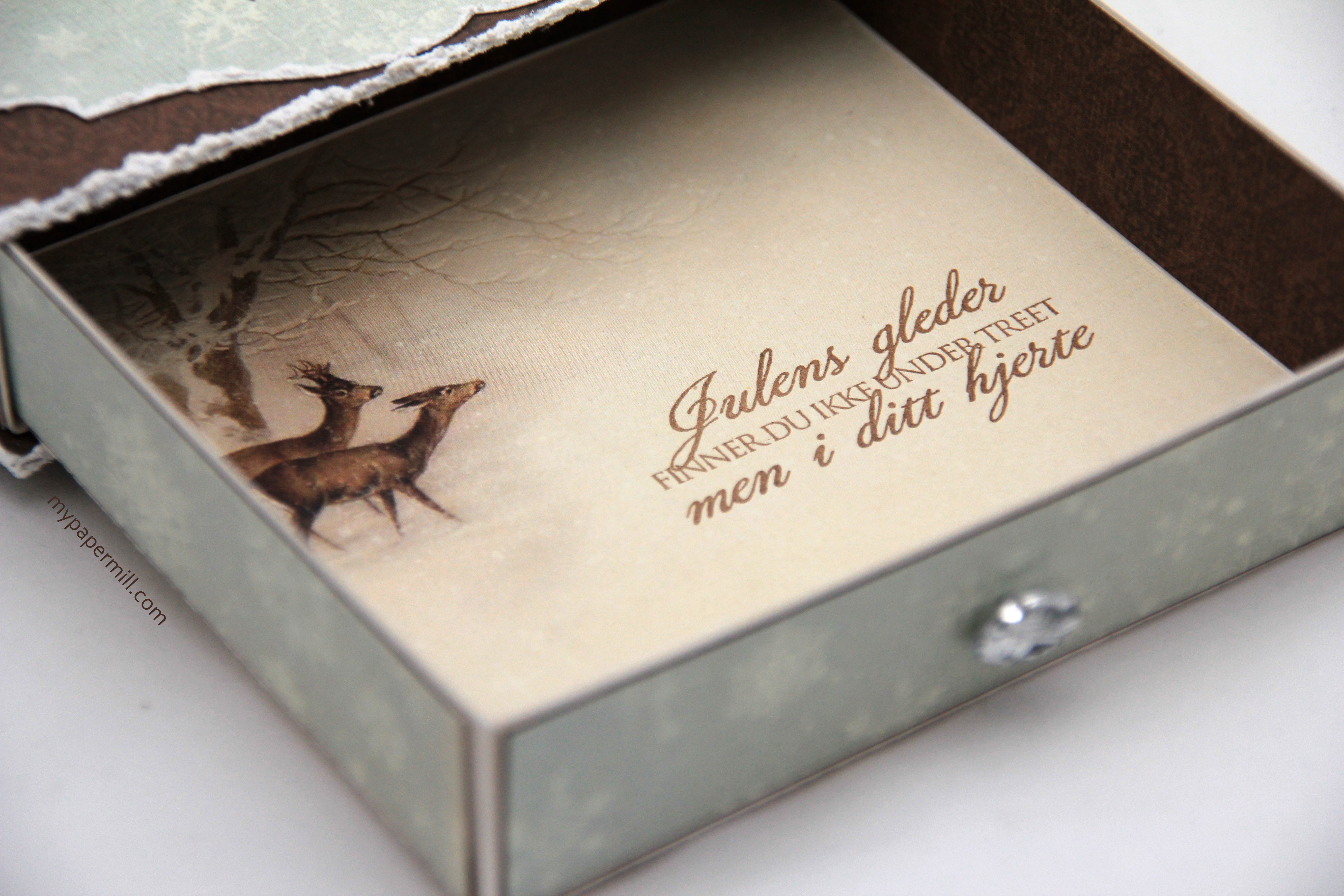 On the second inside I’ve made a pocket to make room for a tag with a personal greeting, diecut using a Magnolia Doohickey die (Jolly Tags). I’ve added a seam binding bow to the tag and a jute string bow on top with a button from My Mind’s Eye to finish it off. The Stempelglede text stamp on the pocket is stamped with Memento Rich Cocoa ink and I’ve added 3 pearls from Kort & Godt as the last little finish on this second inside.