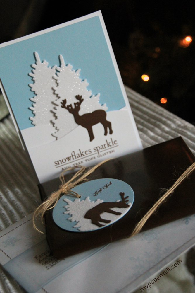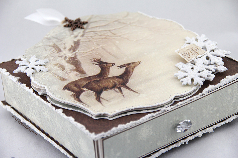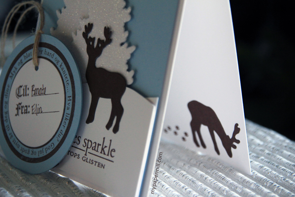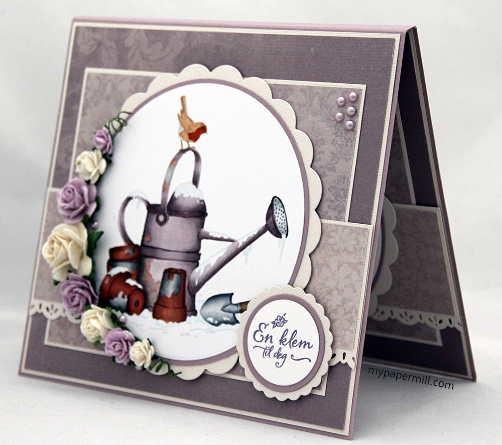 On the second inside I’ve made a pocket to make room for a tag with a personal greeting, diecut using a Magnolia Doohickey die (Jolly Tags). I’ve added a seam binding bow to the tag and a jute string bow on top with a button from My Mind’s Eye to finish it off. The Stempelglede text stamp on the pocket is stamped with Memento Rich Cocoa ink and I’ve added 3 pearls from Kort & Godt as the last little finish on this second inside.