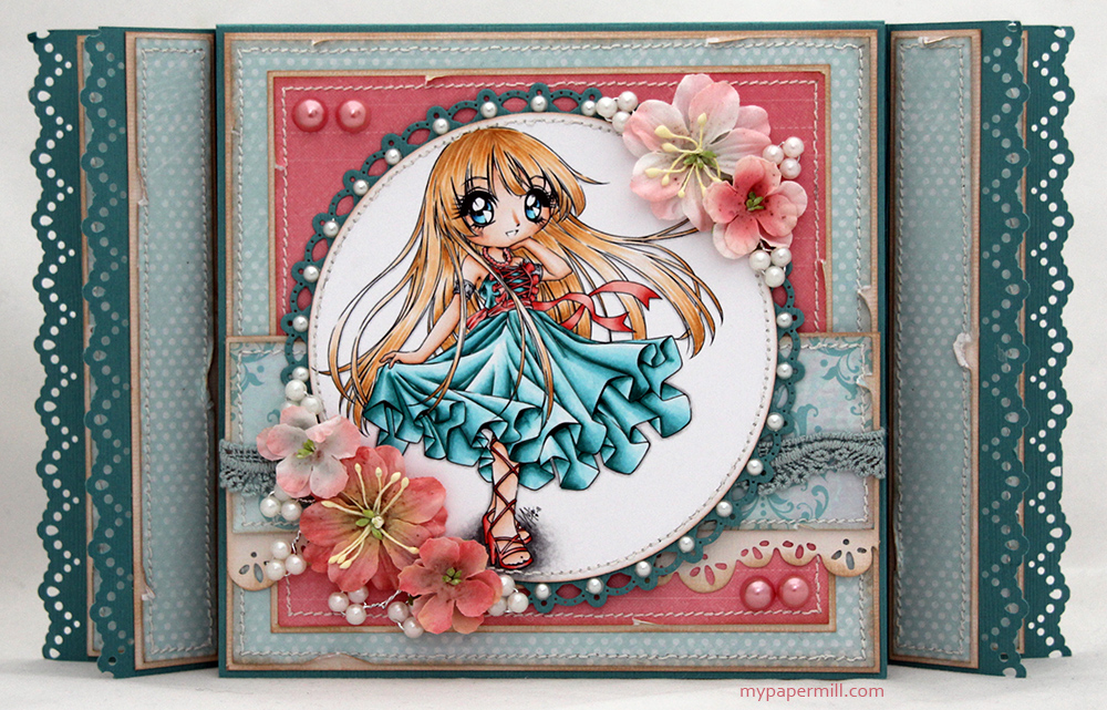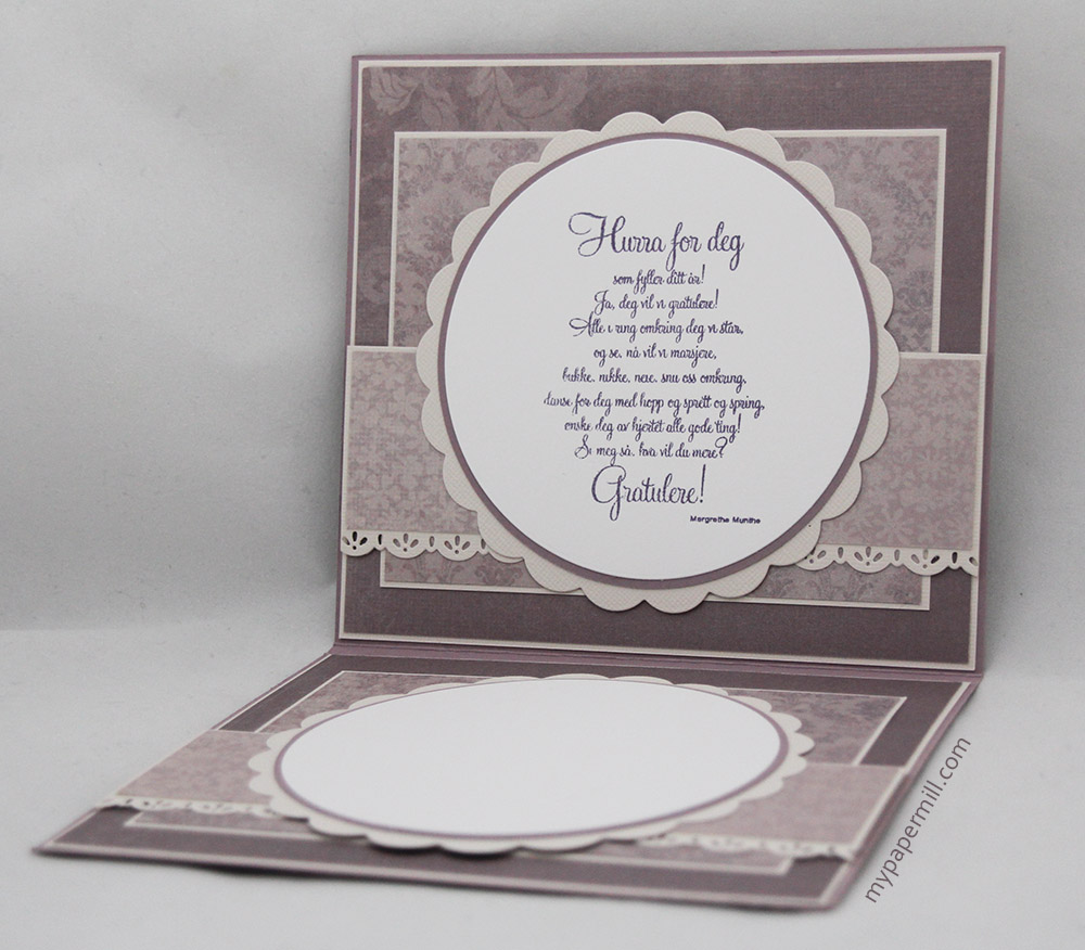 My card for the challenge is a birthday card I sent to our CMN boss lady Siv, her birthday is today. I chose to do a magic card this time, the center part is about 6×6″, so this card is quite large. I’ve taken out products that I rarely use for this one – patterned paper by Melissa Frances (Betty-Ann), Patternscape Design (Brokade 2), and 7 Dots Studio (Love Me), along with Prima flowers. The “wings” are made using a Martha Stewart PATP punch (Vintage Lace) on the Bazzill Rain cardstock. I’ve also used a Magnolia doohickey die (Antique Lace) for the horizontal panel on the center of the card front, and the edges are inked with Creamy Brown ink.