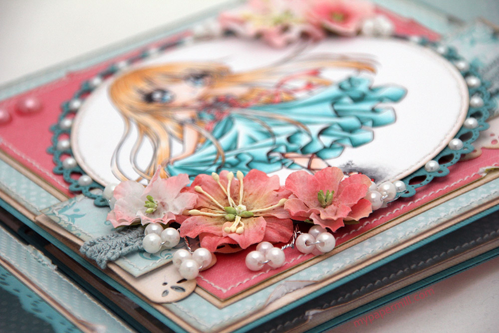 A closer look at the flowers, I’ve also used some pearl stamens by Kort & Godt that I’ve tucked underneath the flowers. I hardly ever use Prima flowers, not because I don’t like them, but because they’re difficult to combine with roses and because this particular corally salmon pink color (shockingly, it’s the only color I have) is a tricky one. The color did, however, match the 7 Dots paper perfectly, making it an easy choice!!