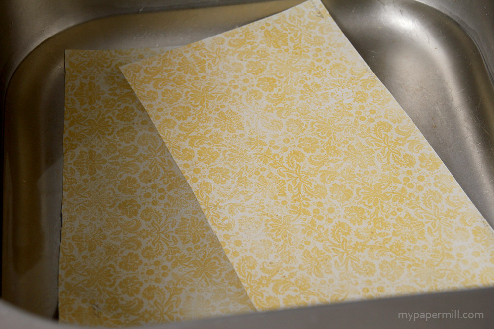 Deretter delte jeg mønsterarket jeg ville bruke i to (arket Påskeegg fra Papirdesign) og bløtla det i vann i kjøkkenkummen. Da jeg tok det ut av kummen (det trenger ikke lang tid, holder i massevis med et halvt minutt) la jeg arkene mellom noen tørk med tørkepapir så de ikke skulle dryppe.