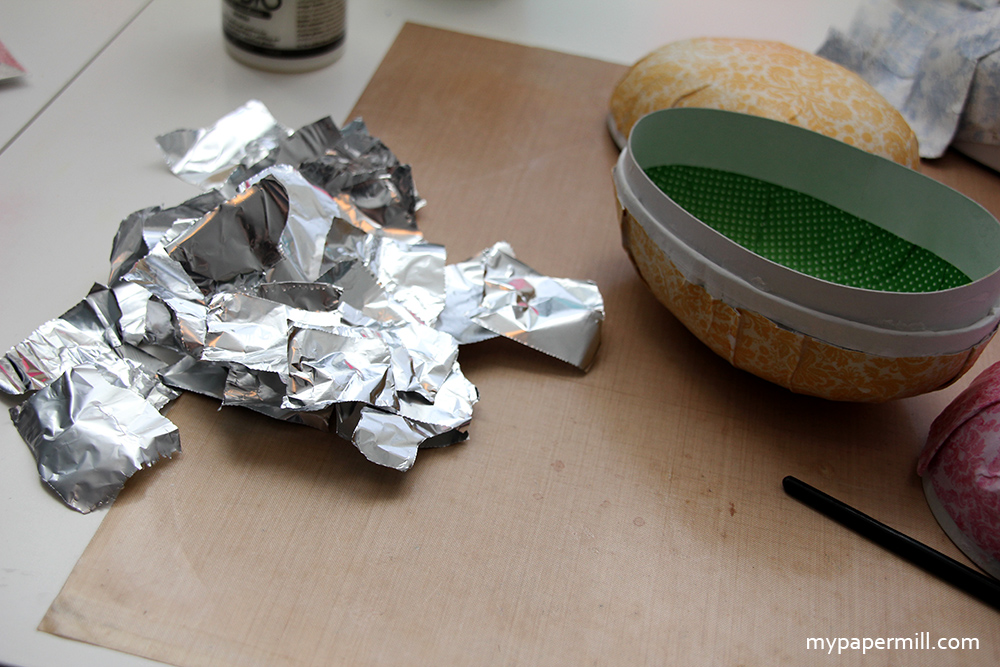 Eggene var opprinnelig grønne inni, men det ville ikke jeg ha, så jeg fant frem litt aluminiumsfolie som jeg delte opp i småbiter og limte hver bit fast til innsiden av egget med multi medium matte.