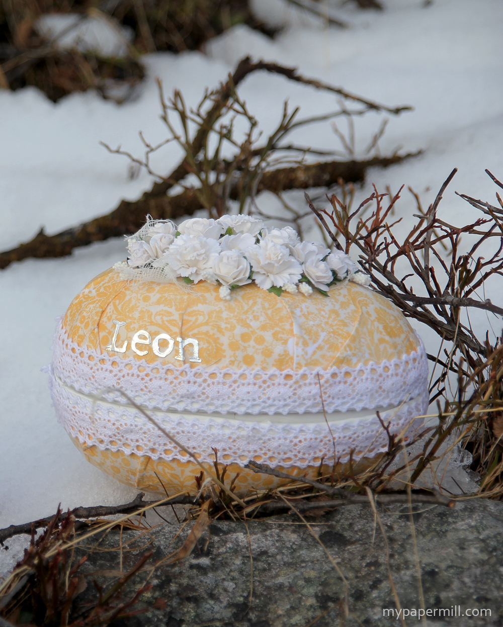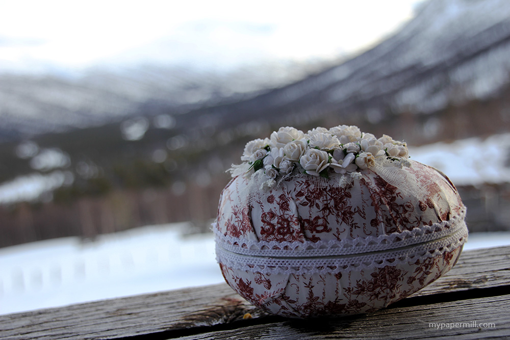 Til slutt gjensto bare en blondekant rundt, navn på siden av egget og pynting med blomster, pyntebær og osteklut på toppen av egget.