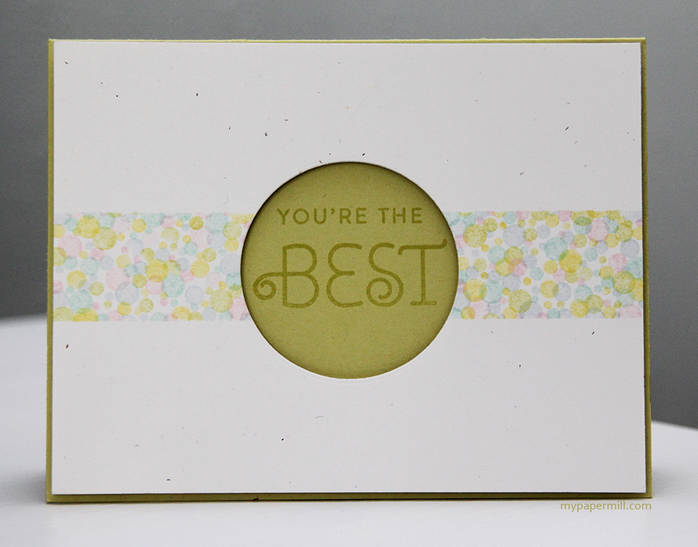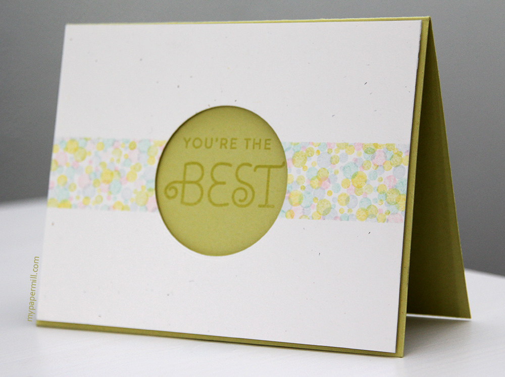 Jeg limte kartongbiten min på en base av Limeade Ice kartong med 3D-teip og stemplet teksten min i det negative rommet med Limeade Ice blekk. Det er faktisk to forskjellige tekststempler som er brukt her. Ordet BEST kommer fra et annet stempel enn resten av teksten. Man får mer ut av stemplene sine når man kan kombinere og bruke de på andre måter enn det som kanskje opprinnelig er tenkt.