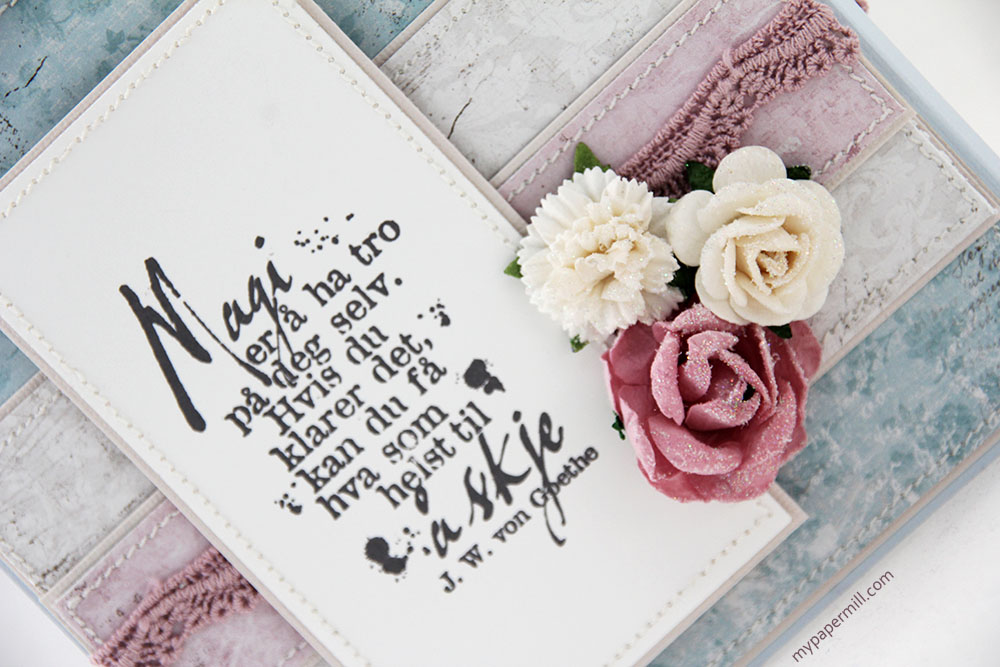 Jeg har brukt Poinsettia-dies fra Magnolia til å lage en julestjerne, og festet en pyntebrad fra Storyteller i midten. Under julestjernen har jeg satt noen kvister, stanset ut med en punch fra Martha Stewart.