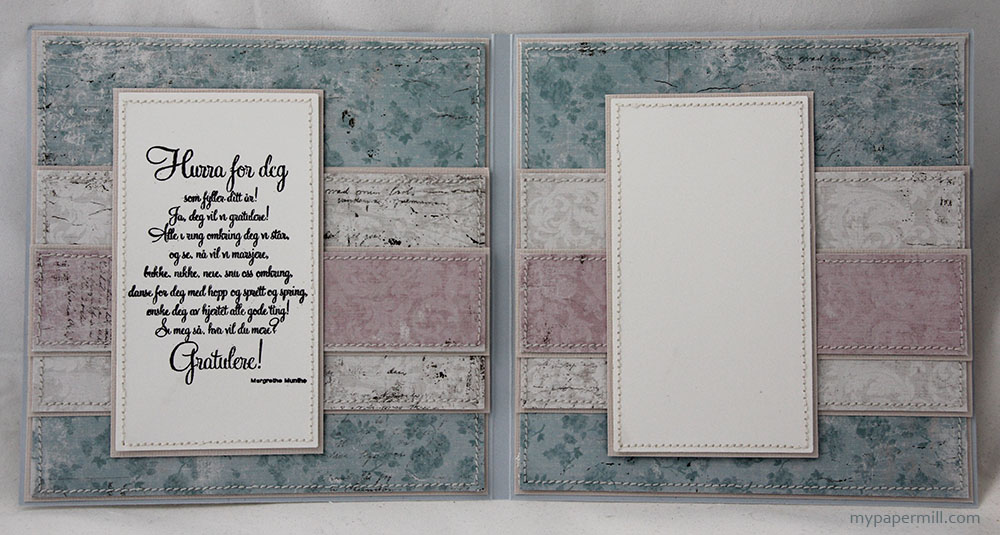 As usual with my cards: roughly the same layout on the insides as the front. I’ve sewn, inked and torn all the panels, and I’ve used the same ink here as I used on the front. The stamp is a really old rubber stamp from Kort & Godt.