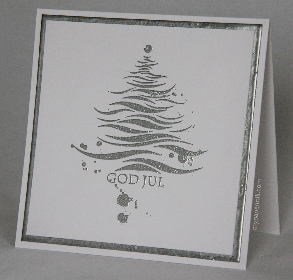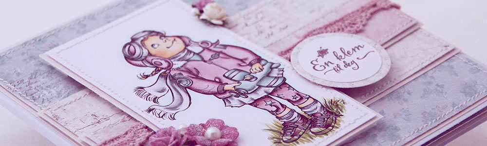 I was the featured guest artist in last year’s December issue of the Norwegian card making magazine Ett Trykk. This is one of the cards I contributed with. These two cute fairies from Mo Manning are my main focus for this card, ready to decorate for Christmas. I put the images together, printed the combined image from PS, and colored with Copics. The card is quite large, it measures 8 1/4 x 5 3/4″ and I added lovely patterned paper from an old paper line by Maja Design. I added two layers of a Spica glitter pen on the chain of baubles the girl is holding, adding a subtle sparkle. I also added some Doodlebug sugar coating glitter on parts of the wings with glossy accents.