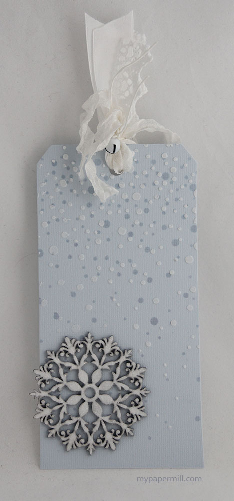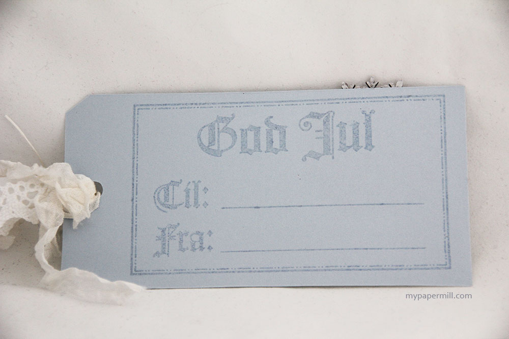 Bak motivet har jeg gjemt en tag, stanset ut med en Sizzix-die. Rundt kantene har jeg svertet Classic Kraft blekk fra Papertrey Ink, og jeg har også stemplet et stempel fra Kort & Godt med samme farge. Jeg har farget hvit seam binding med Copics, laget en sløyfe og festet den i tagen med en bit scrapper’s floss fra Karen Foster og en Classic Kraft knapp fra Papertrey Ink.