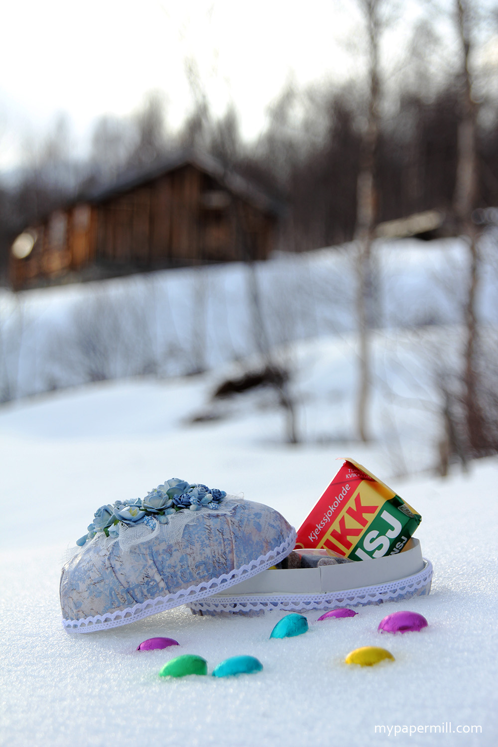 Prosjekt nummer to er ikke et kort, men et påskeegg. Egentlig fire påskeegg, for både nieser og nevø skulle få hvert sitt. Det er ekstra gøy å lage noe som barna virkelig setter pris på når de graver opp eggene sine fra dypt under snøen der påskeharen har gjemt dem!