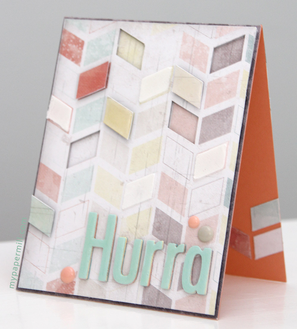 Det ble en del kort i løpet av året som ikke skriker “Jeg er laget av Elin”. Dette kortet føyer seg fint inn i rekken av de kortene. Jeg lot det fantastiske mønsterarket fra 7Dots Studio spille hovedrollen, og med noen av parallellogrammene på 3D-puter og andre parallellogrammer skjært ut ble det akkurat nok liv i mønsterarket til at kortet ikke trengte stort mer. Teksten er laget med seks lag kartong i forskjellige farger som matcher mønsterarket, med et tykt lag glossy accents på toppen!