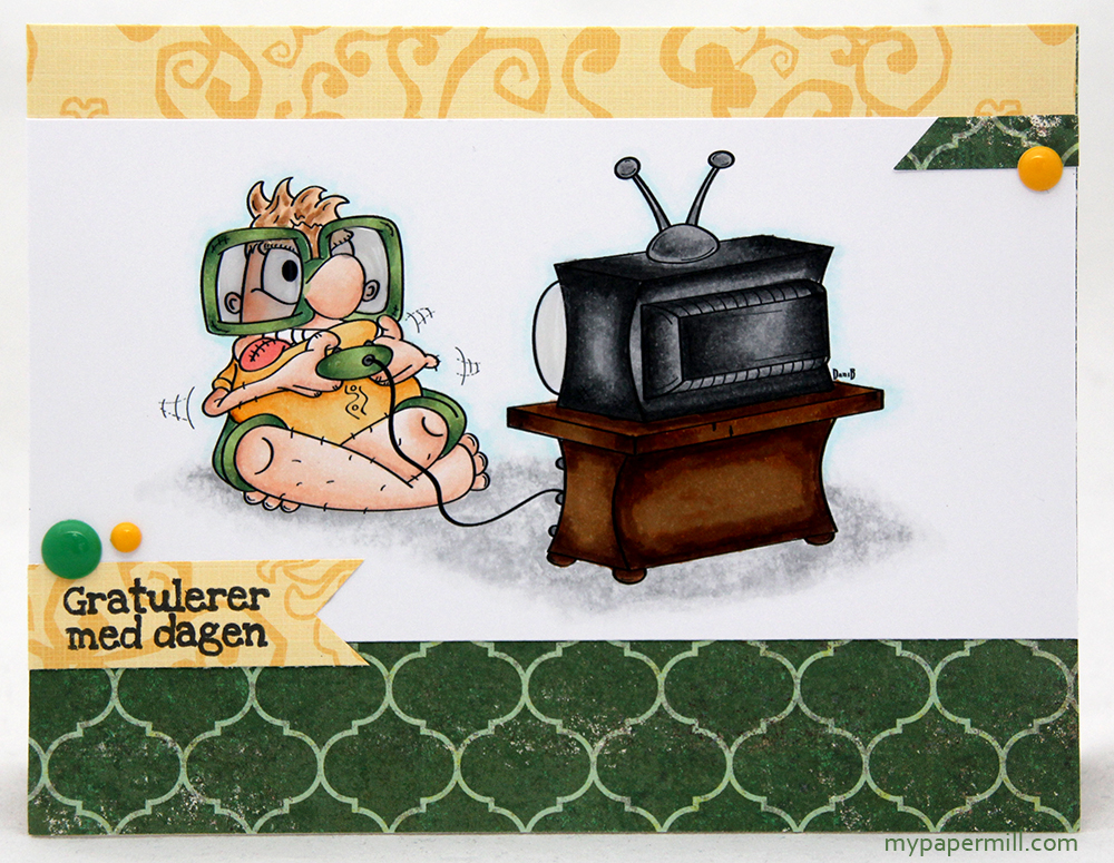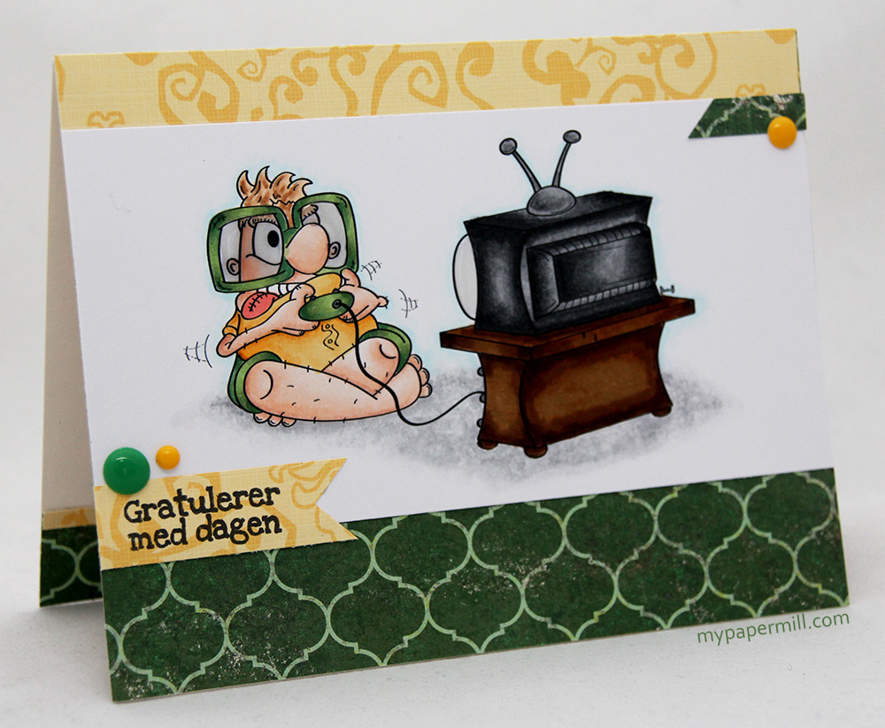 Jeg ringte faktisk til søsteren min og snakket med nevøen min. Jeg spurte ham om hvilke farger han hadde lyst på til kortet sitt, og da han svarte grønt og gult var jeg litt i villrede. Det er ikke akkurat farger jeg bruker så mye av, men jeg måtte jo gjøre et forsøk. Motivet mitt heter Davey Doodlebuns og er et gratismotiv fra JustINKlined. Nevøen min liker å spille spill på PlayStation, så jeg fant ut at motivet var midt i blinken til ham. Brilleglassene og TV-skjermen har fått et lag med glossy accents oppå den svake blåfargen jeg har farget under. Tusjene mine ville ikke oppføre seg ordentlig da jeg skulle farge TV-benken, så den ble litt rar, men sånn blir det bare noen ganger.