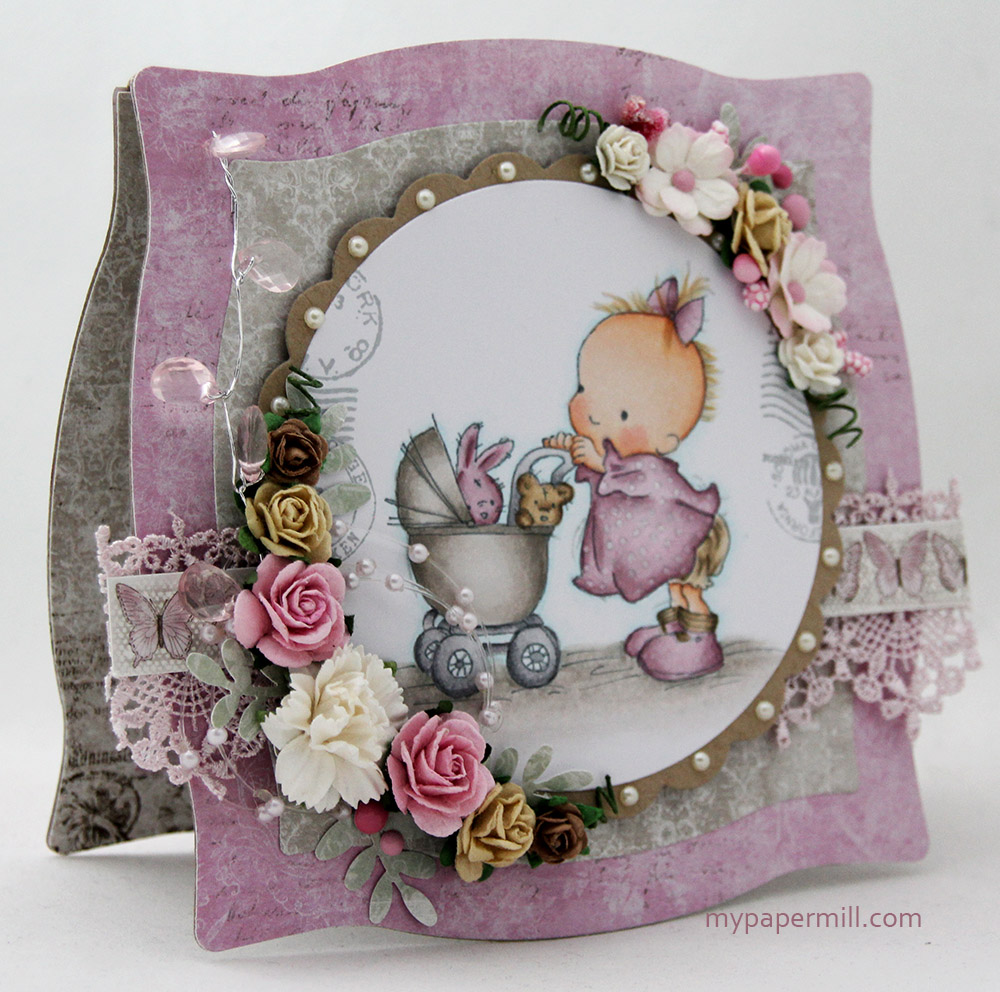 Arkene jeg har brukt kommer fra Maja Design, og bortsett fra det varme grå som er brukt både inni og som et panelene på fronten er alt rester!!! Det føles godt å bruke rester, restehaugen vokser på mystisk vis likevel. Jeg har pyntet med blomster fra Wild Orchid Crafts og Papirloftet, blonde og perlestreng fra Kort & Godt, pyntebær fra Magnolia, en krystallgren fra WOC, perler fra Kaisercraft og roooooosa dotter fra Papirdesign.